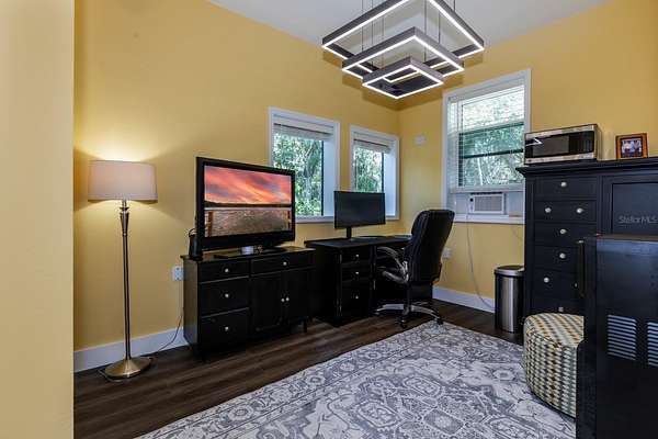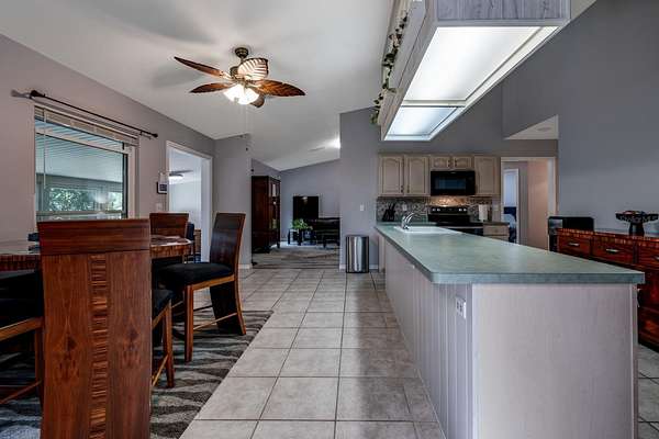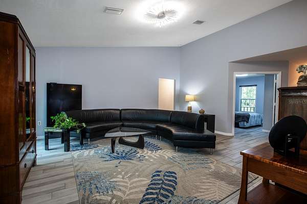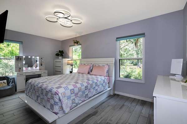 The fully renovated guest bath adds modern comfort, while the guest bedroom overlooks the front yard's newly planted orchard, brimming with avocado, orange, peach, and banana trees. Just minutes from The Villages and Lake Weir, with boat ramps a half-mile away for access to the Chain of Lakes and Silver Springs, this property is a haven for outdoor enthusiasts.