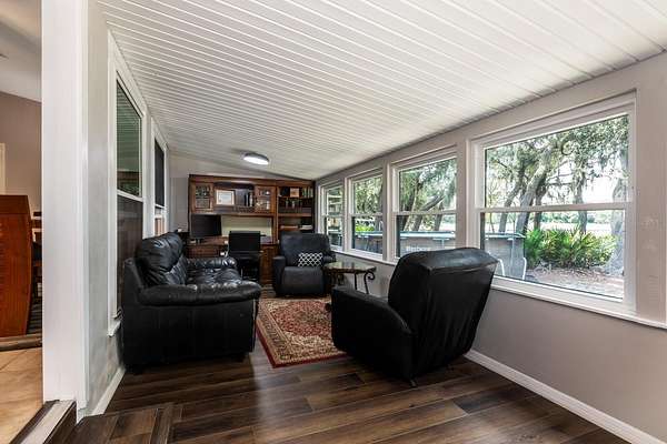 Step outside to a newly renovated private dock and a screened-in lakeside retreat ideal for soaking in the beauty of outdoor country living. A majestic canopy of trees lines the driveway, welcoming you to the home's inviting foyer. Inside, the expansive living room opens up with large windows showcasing breathtaking lake views. Luxury vinyl and tile flooring flow throughout, complemented by a kitchen and separate dining room that share the same stunning waterfront vistas.