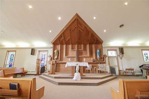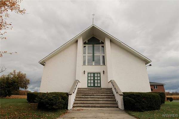 Nestled in the heart of Kendall, this cherished sanctuary once known as St. Mark's Roman Catholic Church, sits on 7.9 acres of beautifully maintained grounds. A spacious parking area welcomes all, while the tranquil setting creates a sense of peace from the moment you arrive. Inside the main worship hall sunlight streams through stained-glass windows casting vibrant color across vaulted ceilings. The atmosphere is reverent & serene. An elevated balcony overlooks the magnificent nave below offering additional seating & a storage area tucked away for convenience. The main entry hosts a large common restroom & a separate gathering room, perfect for overflow seating or quiet conversation. Descending to the ground level you'll discover a generous fellowship hall ideal for receptions & congregational meals. The adjoining kitchen offers remarkable space with abundant cabinetry, counter surfaces, a wide sink & a center island for effortless meal preparation. A second common restroom is located nearby for guests' comfort. Accessibility is thoughtfully incorporated with a wheelchair lift granting easy entrance to the sanctuary level. Three classroom-style rooms & a cozy common room that could support ministry or group needs. Upstairs offers another large room perfect for a classroom or office, plus an auxiliary room for flexible use. A distinct advantage of this property is its single floor ranch style residential wing with its own private entrance. The living quarters includes 3 bedrooms and 2.5 baths, a spacious living room with a wood-burning stove & a formal dining area with sliding doors opening to a landscaped patio. The kitchen provides ample pantry space in addition to a generously sized laundry room. The primary suite features its own full bath, while the remaining two bedrooms share another well-appointed bathroom. Completing this unique offering is a substantial three-bay garage providing storage & practicality. From worship to community outreach this remarkable property offers boundless potential. Its timeless beauty & abundant space are ready to serve a new mission & welcome all who walk through its doors. Offers will be reviewed Friday Novemeber 14th at 9AM.
