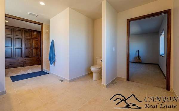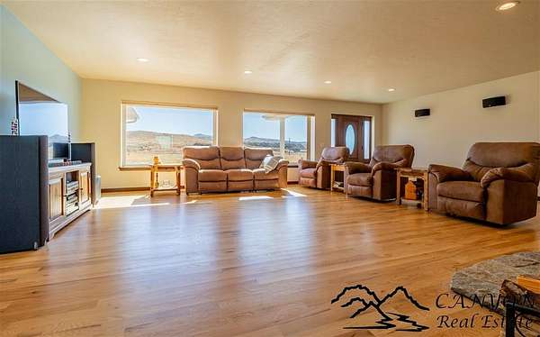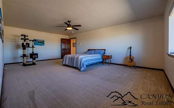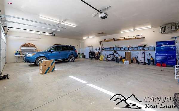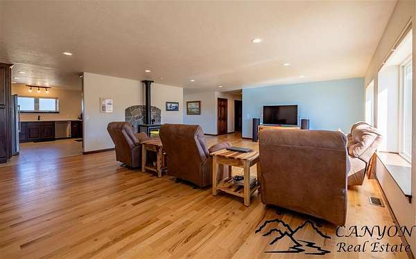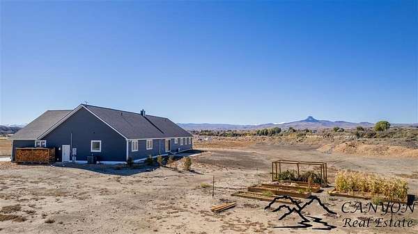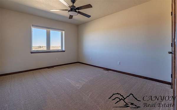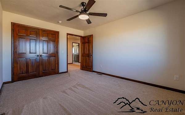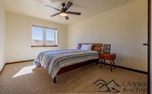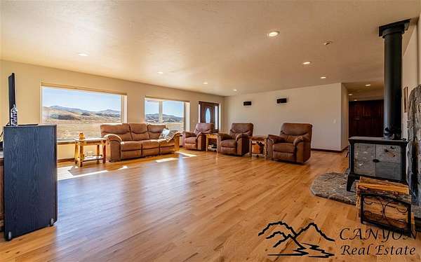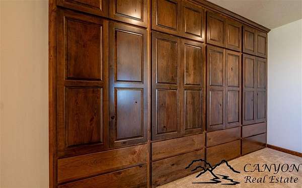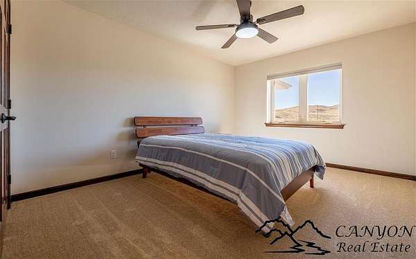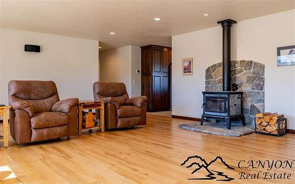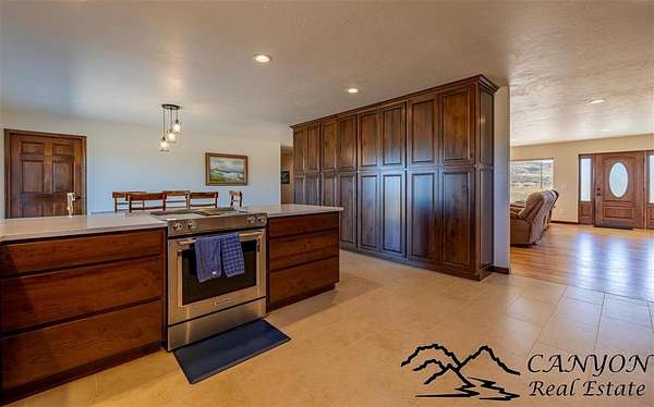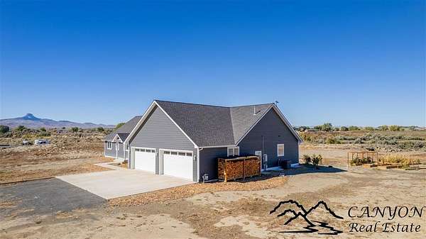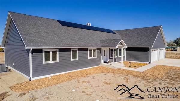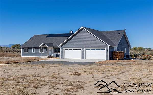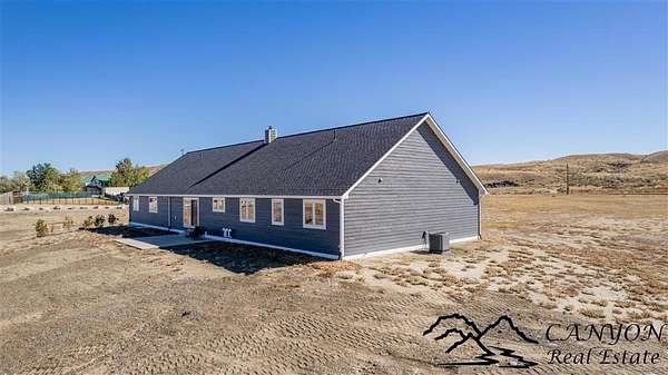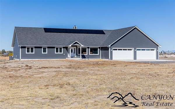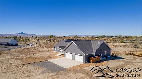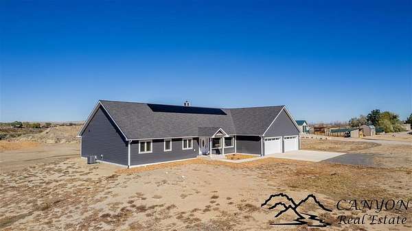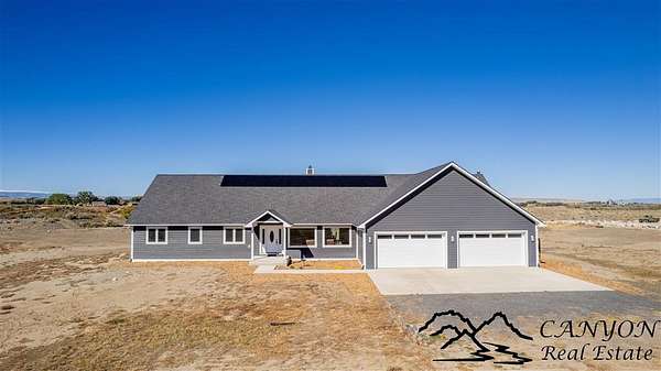 This newly built 3,259+- sq. ft. home offers spacious single-level living with 5 bedrooms, 3 full bathrooms, and a half bath. The residence features custom Cherry wood cabinetry and quartz countertops throughout. The open kitchen and dining area include stainless steel appliances, while large bedrooms and wide hallways enhance comfort and accessibility. The home's high-efficiency design keeps utility costs low, featuring solar panels, a private well, a cozy wood stove adds warmth and comfort, while the mostly finished 1,000+- sq. ft. basement with egress windows offers flexible space for living or storage. Additional highlights include an attached 4-car finished garage, RV parking, and natural, low-maintenance landscaping. Horses are welcome, and minimal covenants allow flexibility without the restrictions of an HOA. Enjoy panoramic mountain views just 15 minutes from Powell, 15 minutes from Cody and an hour from Yellowstone National Park. Outdoor enthusiasts will love the nearby Shoshone River for public fishing and McCullough Peak access for ATV adventures.