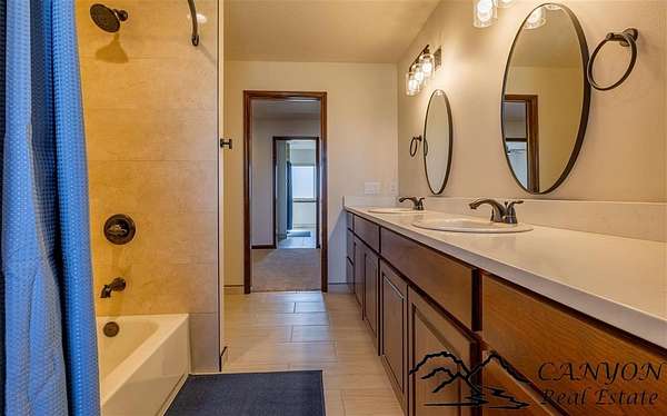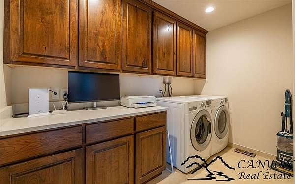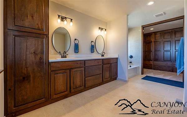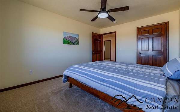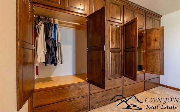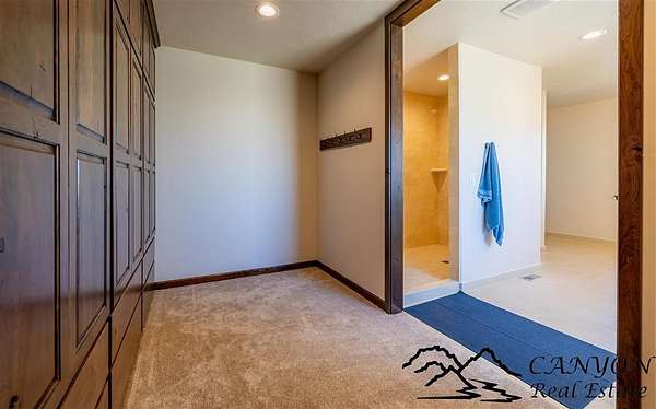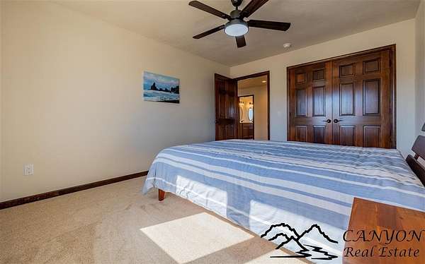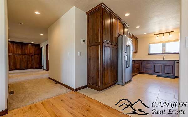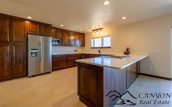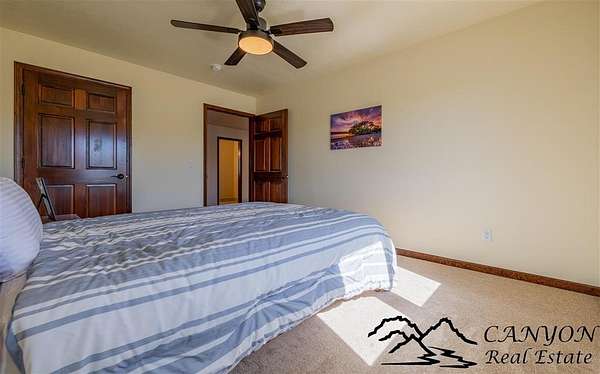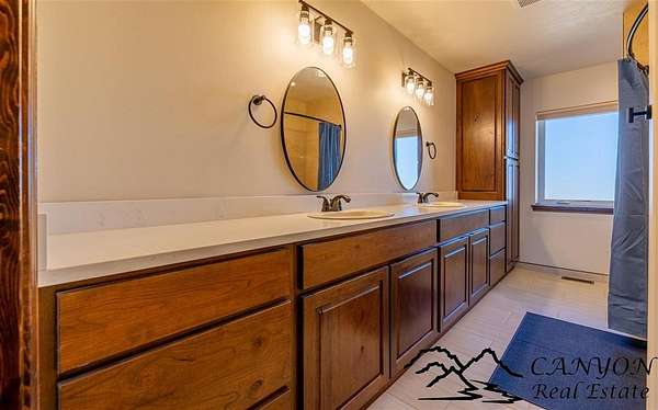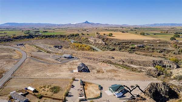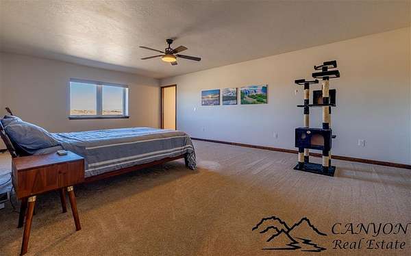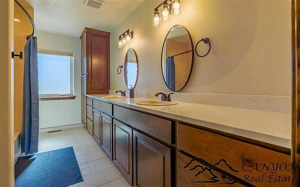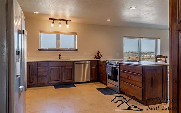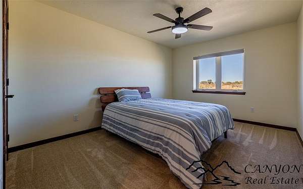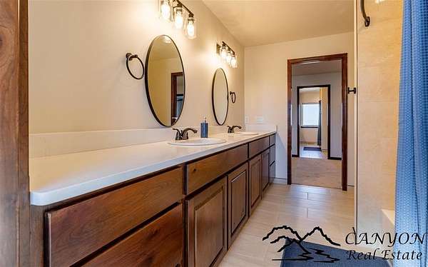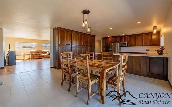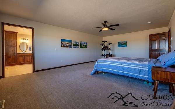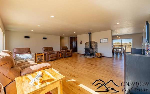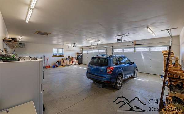 This newly built 3,259+- sq. ft. home offers spacious single-level living with 5 bedrooms, 3 full bathrooms, and a half bath. The residence features custom Cherry wood cabinetry and quartz countertops throughout. The open kitchen and dining area include stainless steel appliances, while large bedrooms and wide hallways enhance comfort and accessibility. The home's high-efficiency design keeps utility costs low, featuring solar panels, a private well, a cozy wood stove adds warmth and comfort, while the mostly finished 1,000+- sq. ft. basement with egress windows offers flexible space for living or storage. Additional highlights include an attached 4-car finished garage, RV parking, and natural, low-maintenance landscaping. Horses are welcome, and minimal covenants allow flexibility without the restrictions of an HOA. Enjoy panoramic mountain views just 15 minutes from Powell, 15 minutes from Cody and an hour from Yellowstone National Park. Outdoor enthusiasts will love the nearby Shoshone River for public fishing and McCullough Peak access for ATV adventures.