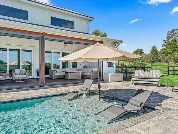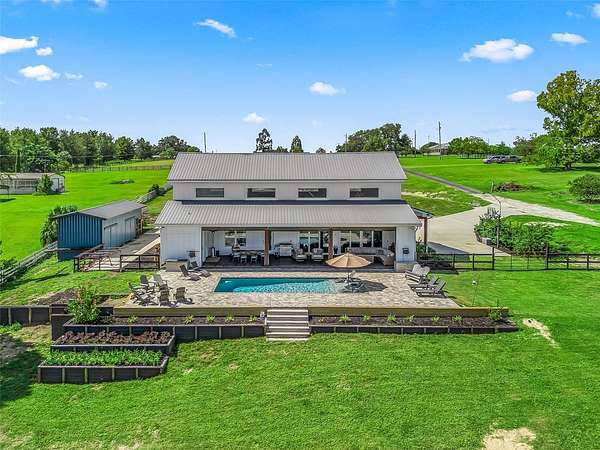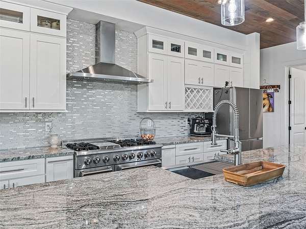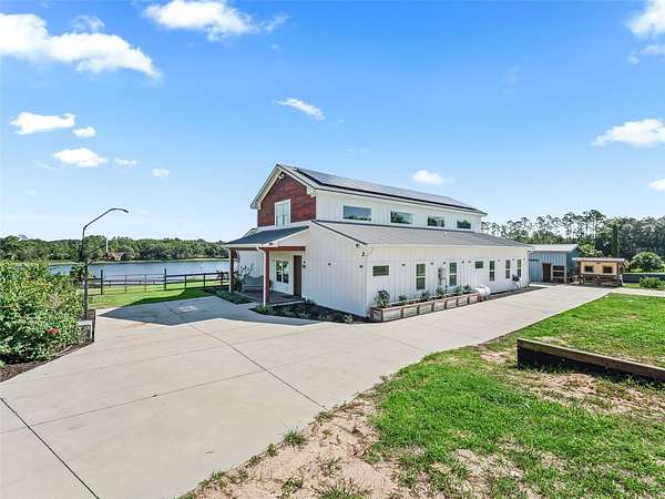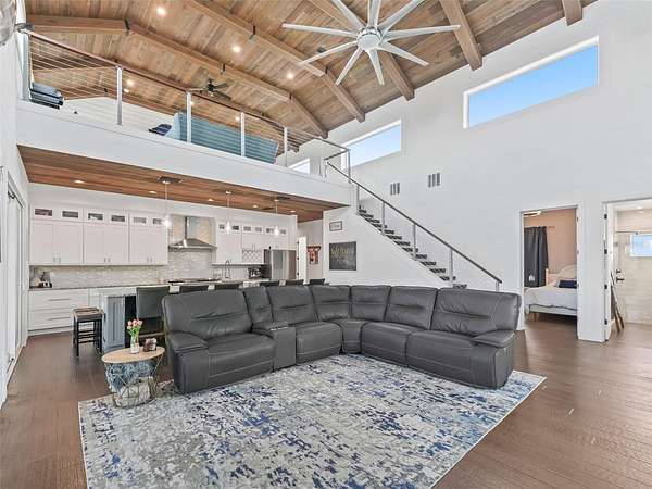 Perched high above the shoreline of spring-fed Saddlebag Lake, this breathtaking 4-bedroom, 3.5-bathroom custom-built modern farmhouse offers a barndominium-style design that blends rustic charm with contemporary luxury. The open floor plan boasts soaring 20+ ft ceilings in the main living area, a spacious loft sitting area, and an entertainer's dream chef's kitchen featuring a striking 15-foot island, dual-fuel stove with propane cooktop & electric oven, and premium finishes.