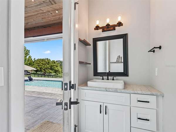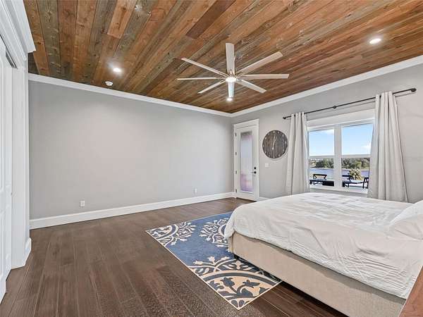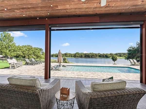 From the living area, enjoy panoramic views that stretch over the sparkling pool to the tranquil waters of the lake. Step outside to your expansive covered back porch with remote-control screens, where you can relax in the gentle breeze and take in 150 feet of private lake frontage.