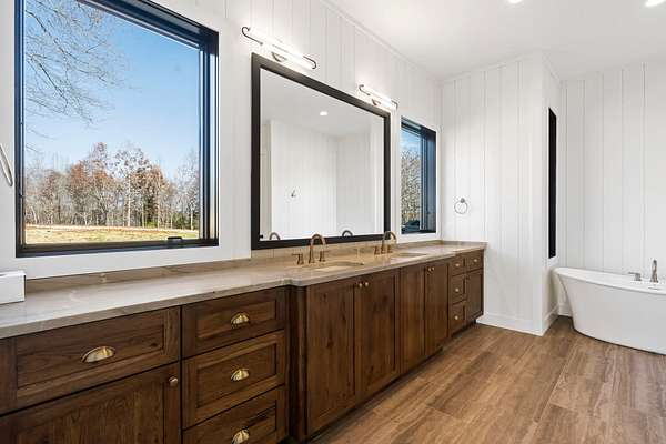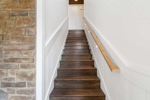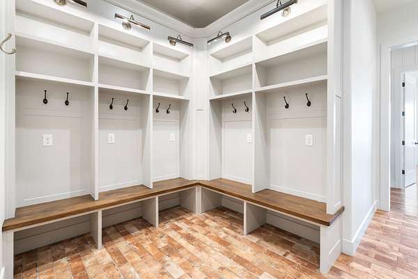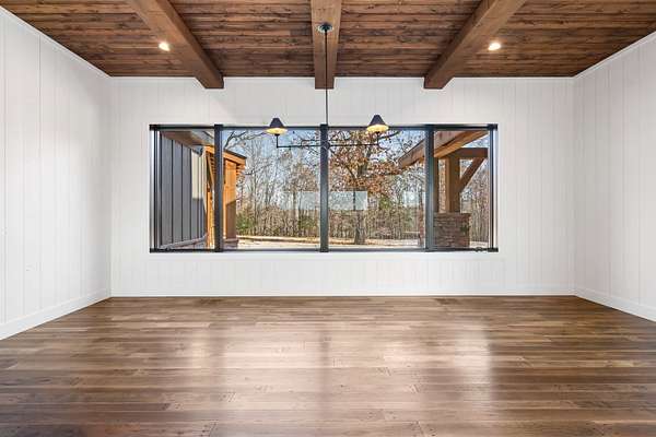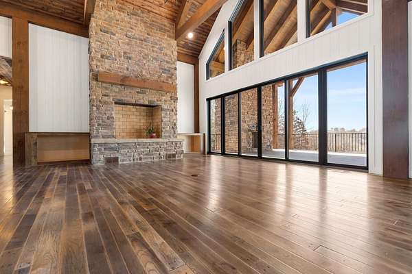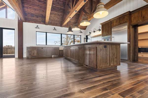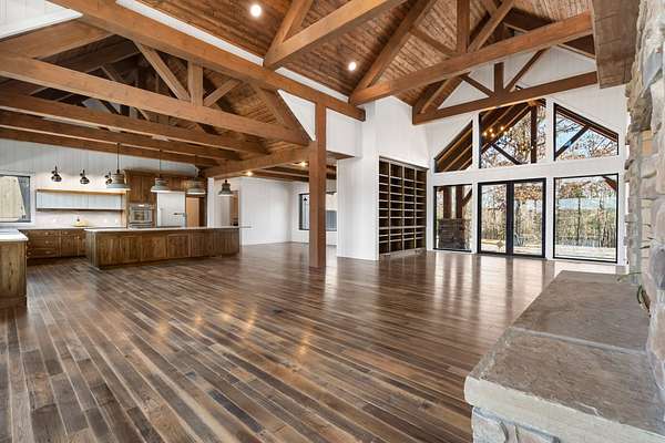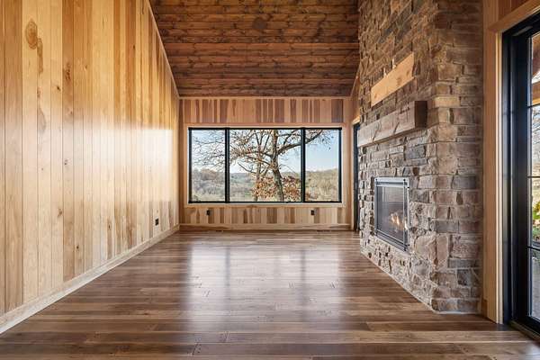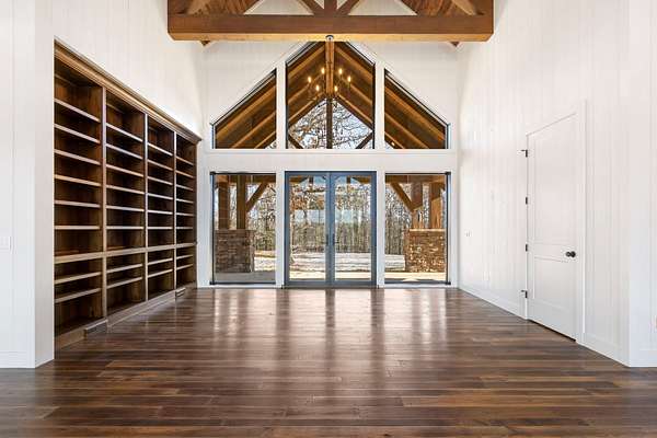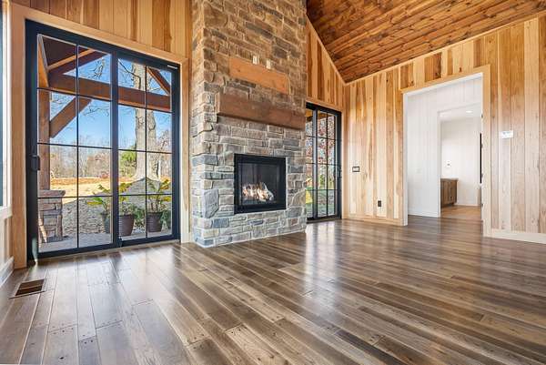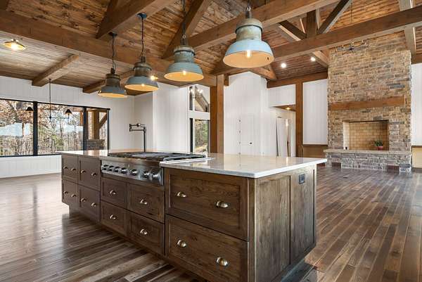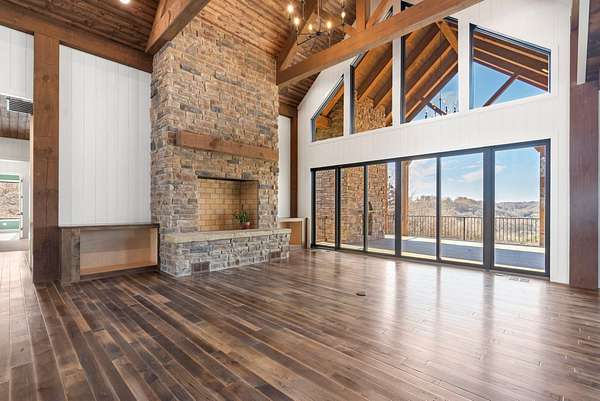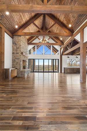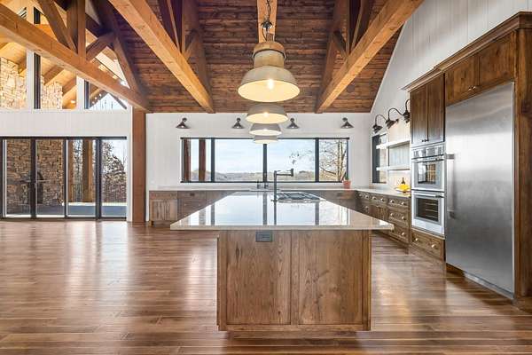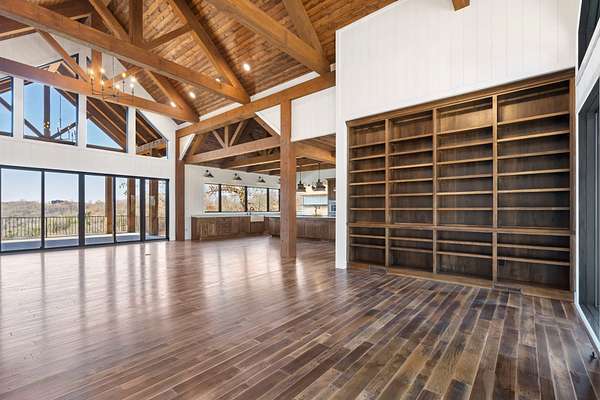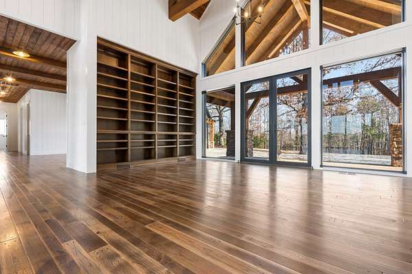 From the moment you step inside, the home makes a commanding impression. A grand entry welcomes you with soaring 22-foot ceilings, anchored by massive 12-inch beams and a statement fireplace that mirrors the impressive scale of the living space. The main level is adorned with custom Tennessee hardwood flooring throughout, setting a warm yet refined tone.