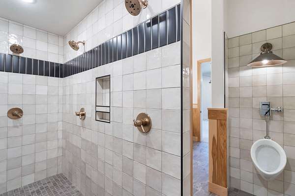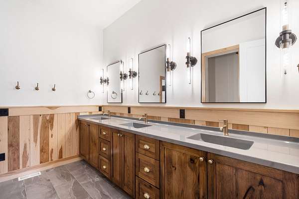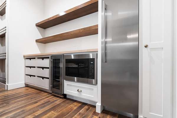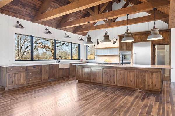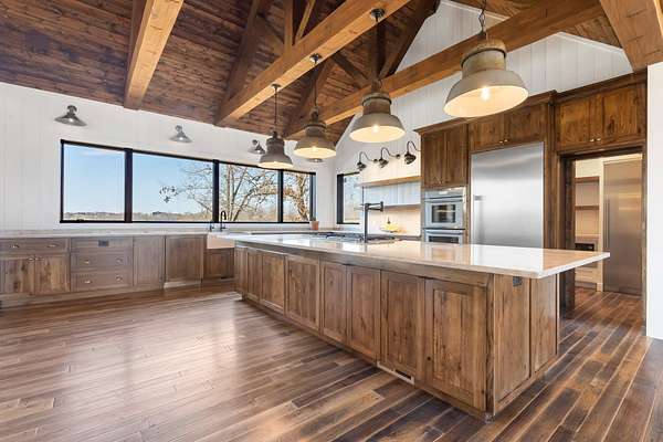At the heart of the home lies a chef's kitchen designed to impress and perform. Finished with premium quartzite surfaces, it features an extraordinary 4.5-foot by 13-foot island, complemented by a full Thermador appliance suite. Above, a striking set of custom train-station pendant lights-fully restored and imported from a historic German rail station-adds a rare and unforgettable design element.