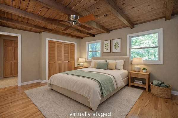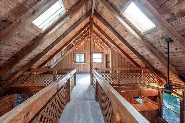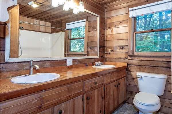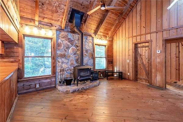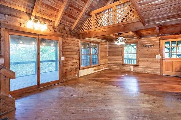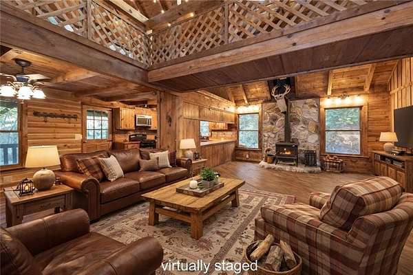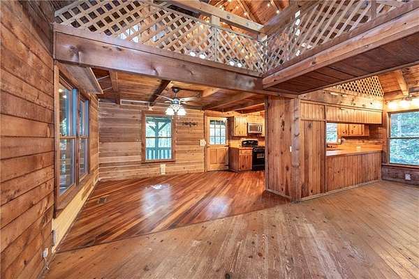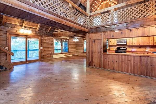 New Price! Mountain Cabin on 2.3 Acres with VIEWS! Bring your improvement skills and make this property into a showplace. Tucked away on 2.3 wooded acres, this MOVE IN READY 3 bedroom (3rd is loft bedroom), 3 bath Log Cabin is located in the gated community of Burnt Mountain Estates. Authentic log walls, open floor plan, wood floors, brand new carpet upstairs and an abundance of natural light, The Main Level features a spacious 2 story great room with a 2018 wood stove, the kitchen with plenty of cabinets and counter space, dining area, and a spacious Bedroom and Full Bath. Walk out onto the huge screened porch which connects to the covered from porch, perfect for relaxing and enjoying the MOUNTAIN VIEWS. Stay cozy year-round with a newer wood stove AND central heat. Upstairs, a large loft with closet area offers the 3rd bedroom or an office or reading nook, along with the Second bedroom and Full bath. The full basement is a rare find in a cabin, complete with a finished full bath plus a 4th Bedroom to be finished and plenty of room to use as a workshop, storage, or future living area.Sellers improvements during their ownership make this home move-in readyjust bring your vision and love for mountain living. Whether youre looking for a primary home or weekend retreat, this one checks all the boxes. ASK TO SEE THE IMPROVEMENTS LIST. Septic system permitted for 2 bedrooms, expansion may be possible if desired. Floor plan is not meant to be relied upon for measurements. Water is from a community well.