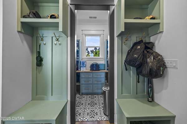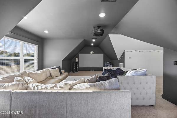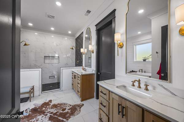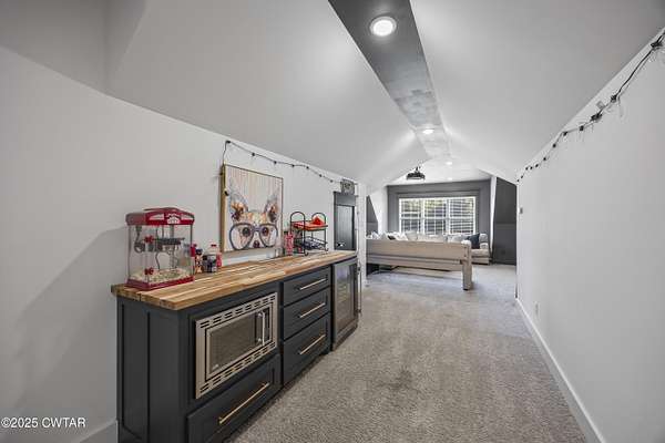 - Breakfast Bar, Cathedral Ceiling(s), Ceiling Fan(s), Ceramic Tile Shower, Commode Room, Crown Molding, Double Vanity, Eat-In Kitchen, Entrance Foyer, High Ceilings, Kitchen Island, Open Floorplan, Pantry, Primary Downstairs, Soaking Tub, Sound System, Vaulted Ceiling(s), Walk-In Closet(s)