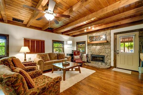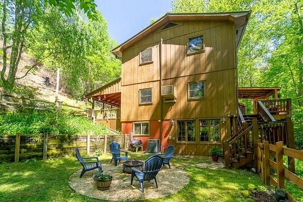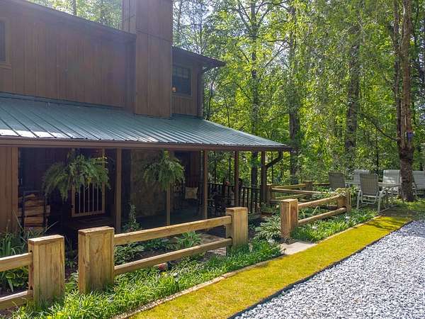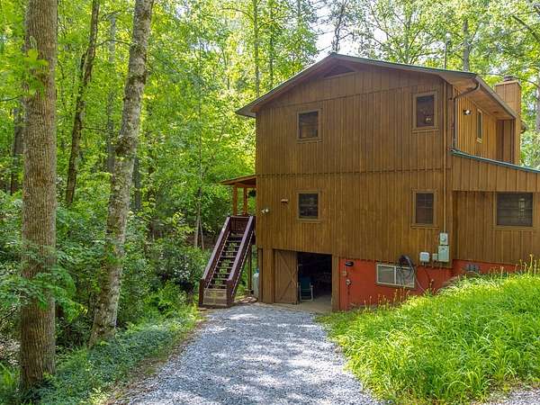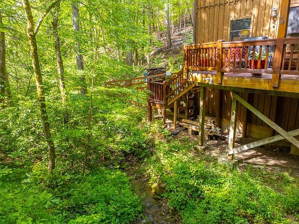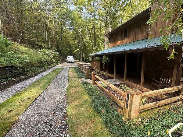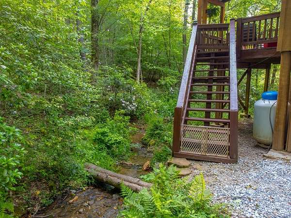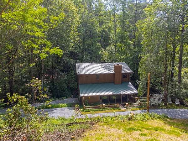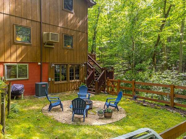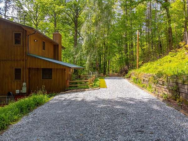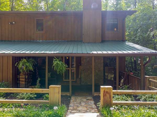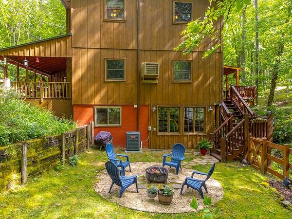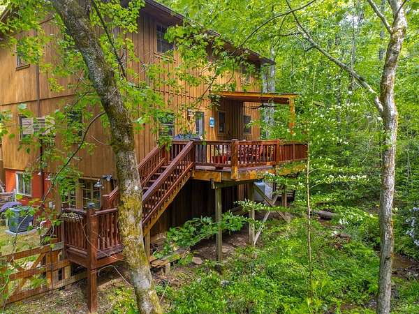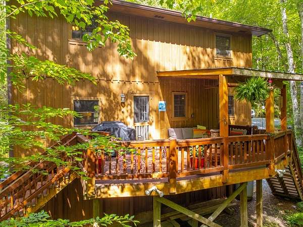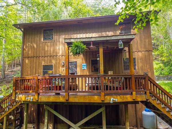 Nestled in a peaceful wooded setting, this charming rustic cabin offers the perfect escape from the hustle and bustle of everyday life. Step out onto the back deck to enjoy the soothing sounds of the rushing stream just below or gather around the backyard fire pit. With 3 bedrooms and 2 bathrooms, this home combines the warmth of nature with the comforts of easy living. Step inside to a cozy living area featuring a wood burning fireplace and a standalone gas fireplace--ideal for chilly mountain evenings. The large eat-in kitchen boasts a gas range and convenient main-level laundry. Upstairs, you'll find 3 spacious bedrooms and a full bath, all with tongue-and-groove ceilings and rustic hardwood floors that enhance the cabin's natural charm. Custom made blinds are on all windows throughout. The unfinished basement provides ample storage and a walk-out workshop area--perfect for hobbies or a game room. The whole exterior has been recently stained. Home comes with a healthy amount of furniture to get you started! Whether you're seeking a serene second home, a vacation rental, or a primary residence, this cabin offers a one-of-a-kind setting where nature and tranquility meet.