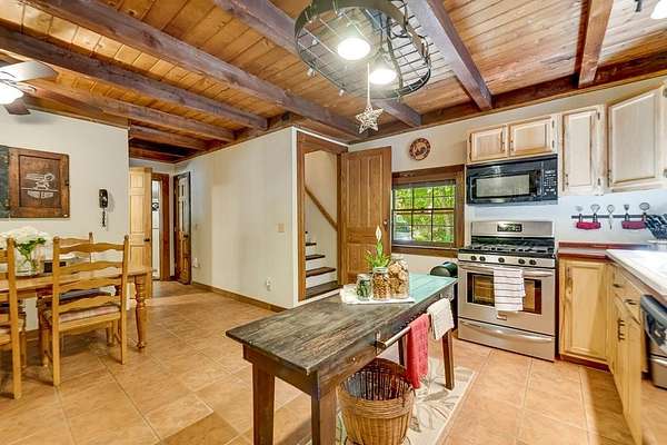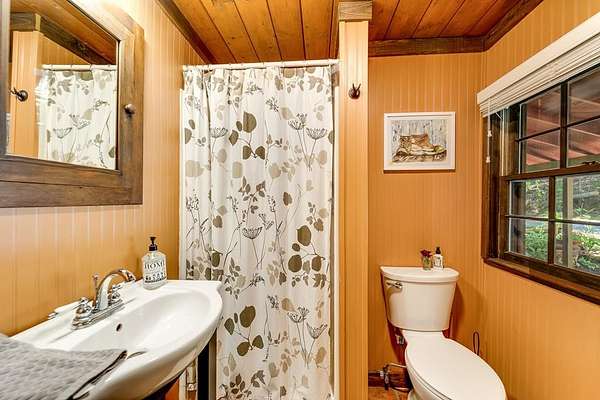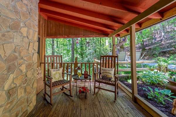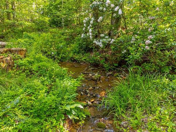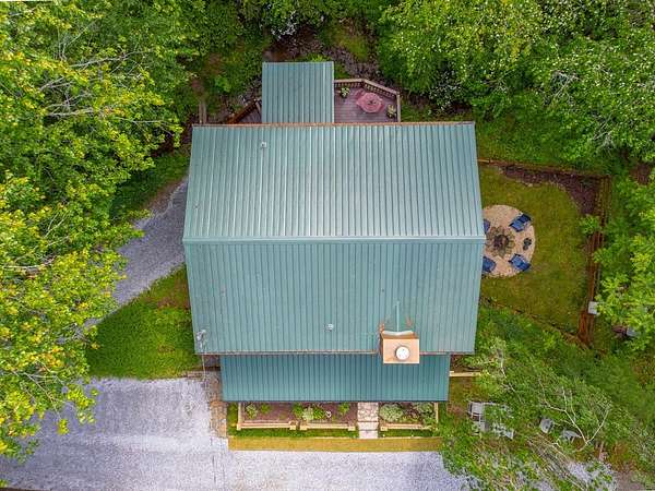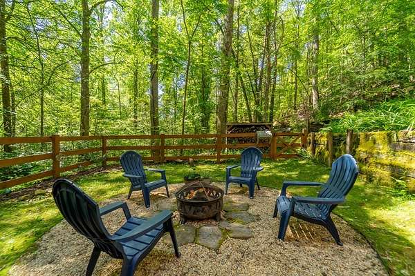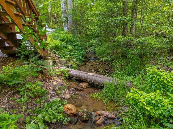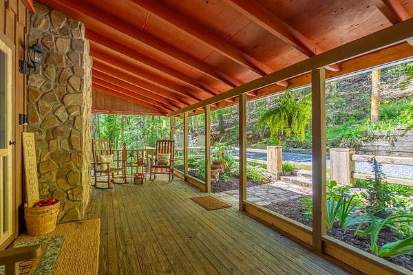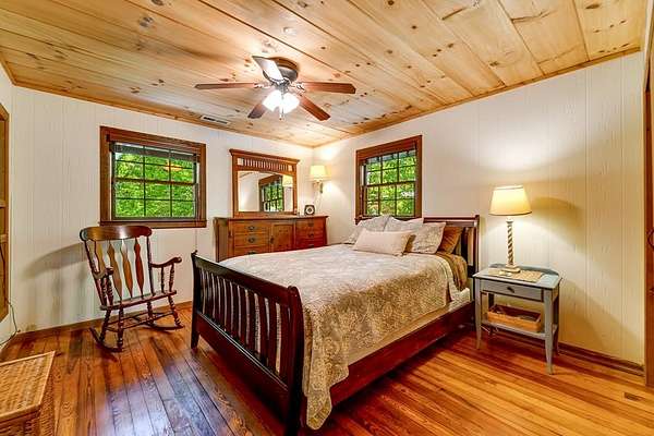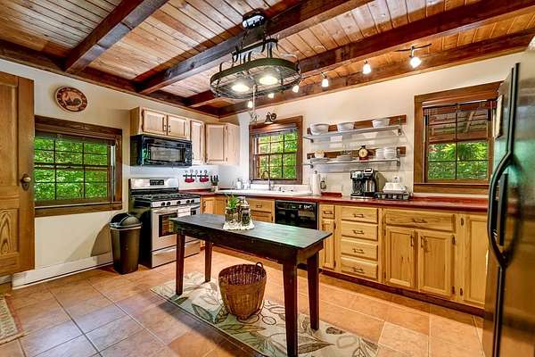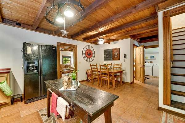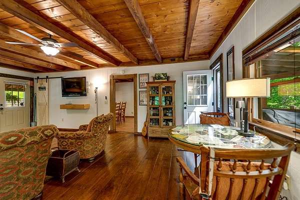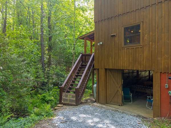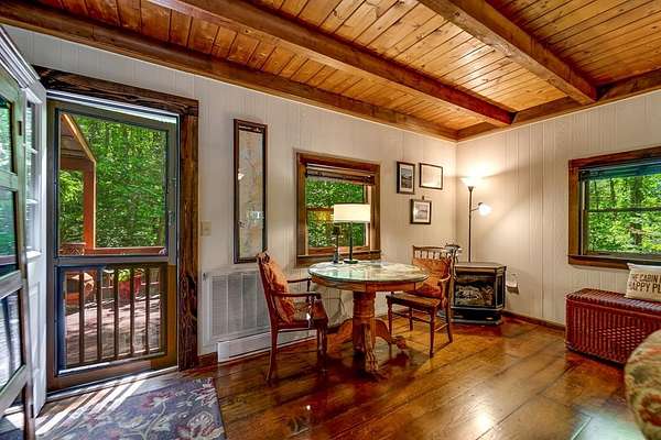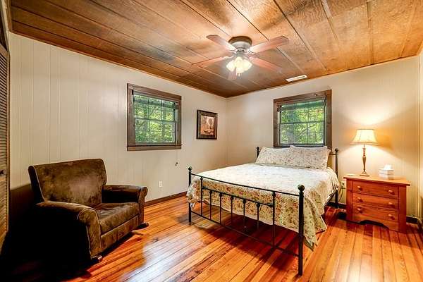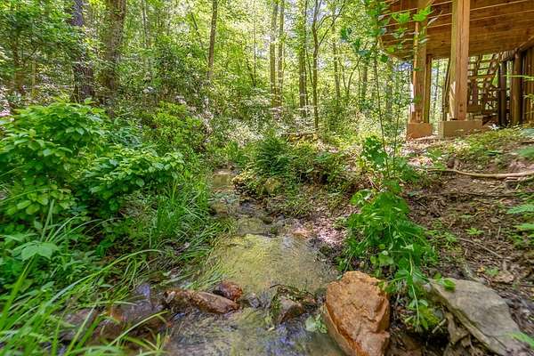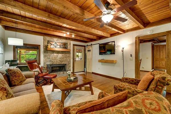 Nestled in a peaceful wooded setting, this charming rustic cabin offers the perfect escape from the hustle and bustle of everyday life. Step out onto the back deck to enjoy the soothing sounds of the rushing stream just below or gather around the backyard fire pit. With 3 bedrooms and 2 bathrooms, this home combines the warmth of nature with the comforts of easy living. Step inside to a cozy living area featuring a wood burning fireplace and a standalone gas fireplace--ideal for chilly mountain evenings. The large eat-in kitchen boasts a gas range and convenient main-level laundry. Upstairs, you'll find 3 spacious bedrooms and a full bath, all with tongue-and-groove ceilings and rustic hardwood floors that enhance the cabin's natural charm. Custom made blinds are on all windows throughout. The unfinished basement provides ample storage and a walk-out workshop area--perfect for hobbies or a game room. The whole exterior has been recently stained. Home comes with a healthy amount of furniture to get you started! Whether you're seeking a serene second home, a vacation rental, or a primary residence, this cabin offers a one-of-a-kind setting where nature and tranquility meet.