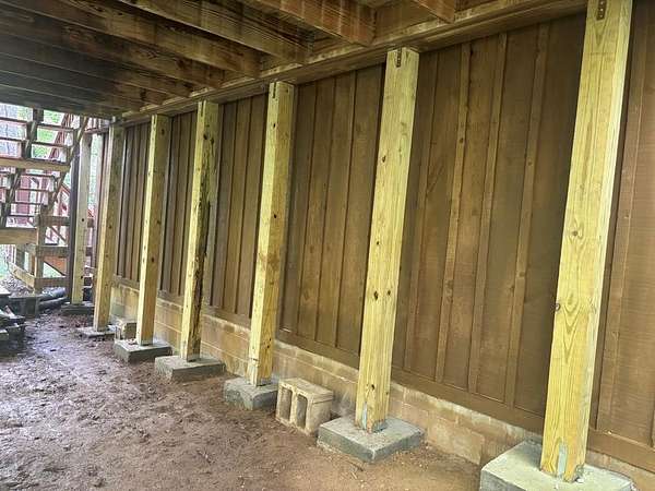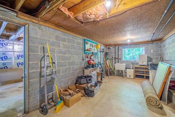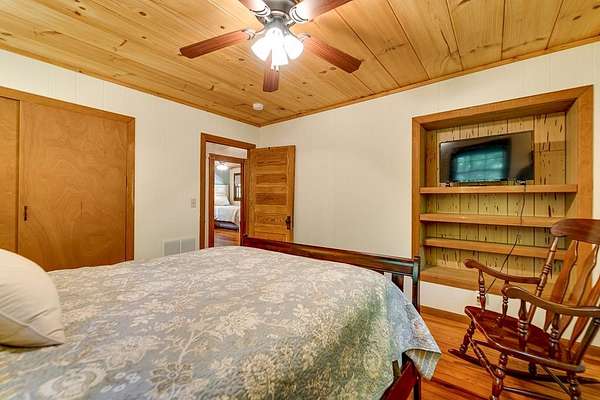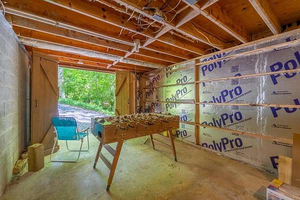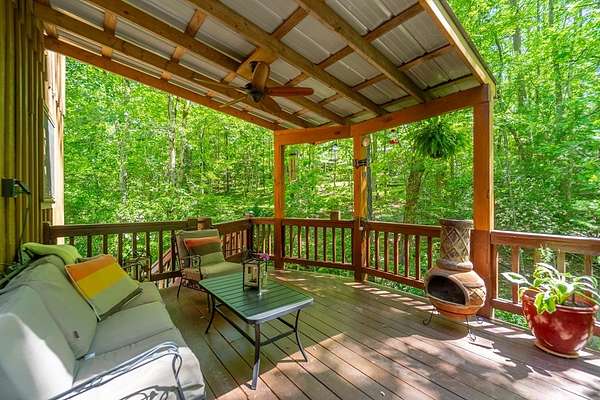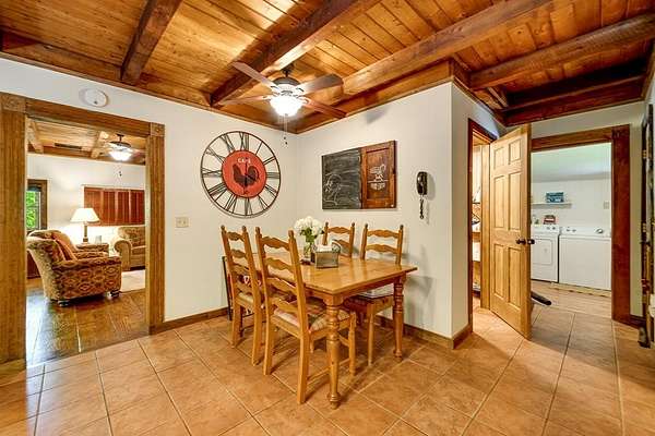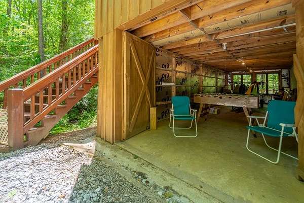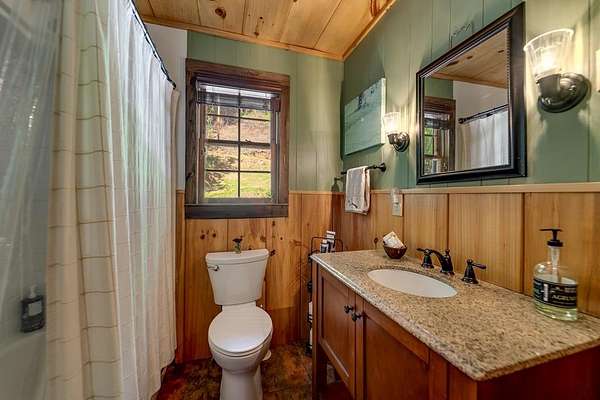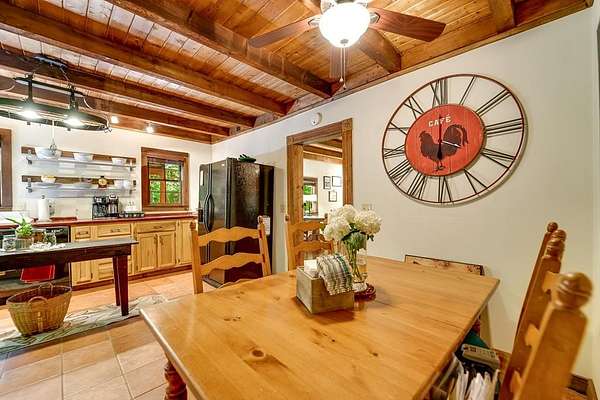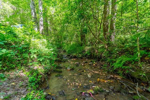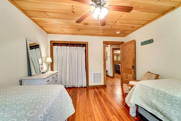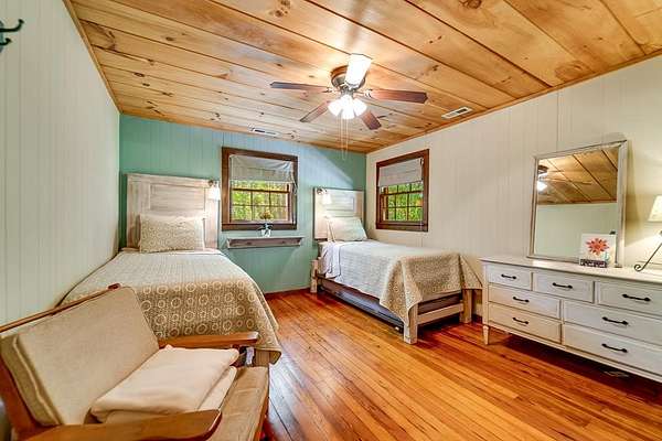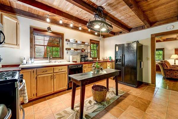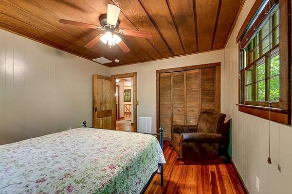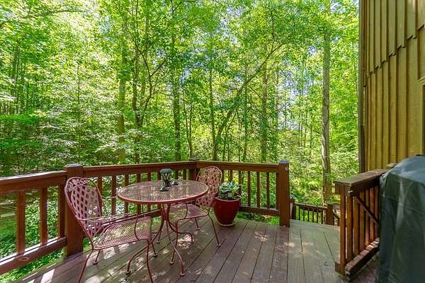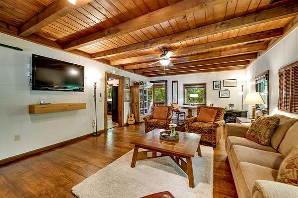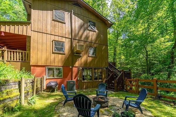 Nestled in a peaceful wooded setting, this charming rustic cabin offers the perfect escape from the hustle and bustle of everyday life. Step out onto the back deck to enjoy the soothing sounds of the rushing stream just below or gather around the backyard fire pit. With 3 bedrooms and 2 bathrooms, this home combines the warmth of nature with the comforts of easy living. Step inside to a cozy living area featuring a wood burning fireplace and a standalone gas fireplace--ideal for chilly mountain evenings. The large eat-in kitchen boasts a gas range and convenient main-level laundry. Upstairs, you'll find 3 spacious bedrooms and a full bath, all with tongue-and-groove ceilings and rustic hardwood floors that enhance the cabin's natural charm. Custom made blinds are on all windows throughout. The unfinished basement provides ample storage and a walk-out workshop area--perfect for hobbies or a game room. The whole exterior has been recently stained. Home comes with a healthy amount of furniture to get you started! Whether you're seeking a serene second home, a vacation rental, or a primary residence, this cabin offers a one-of-a-kind setting where nature and tranquility meet.