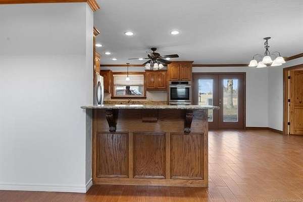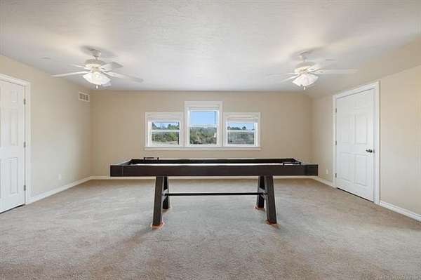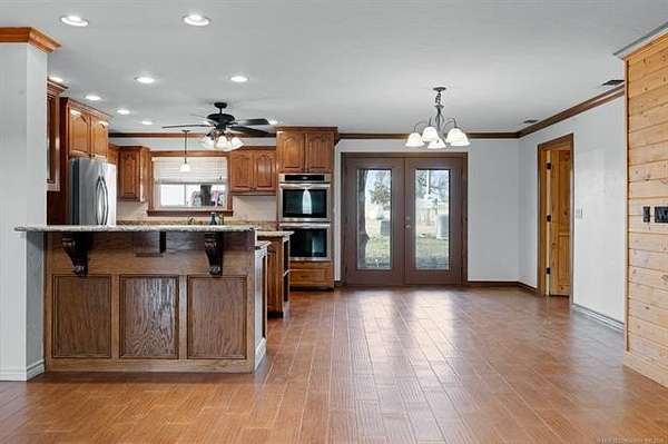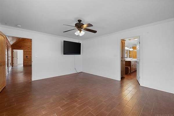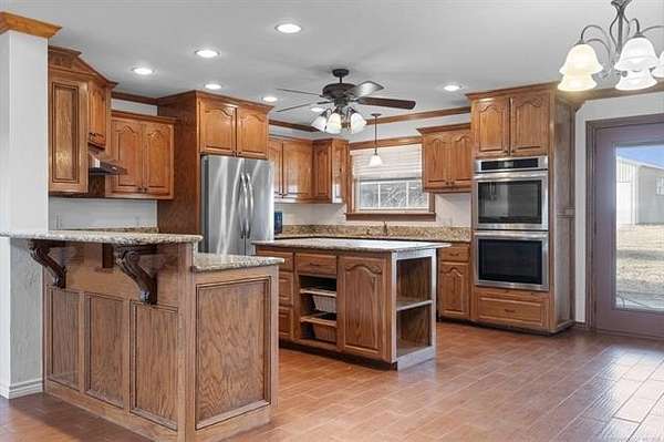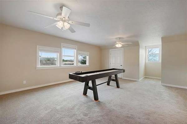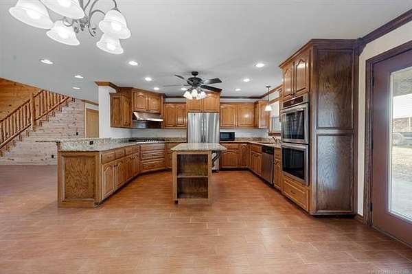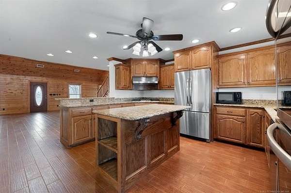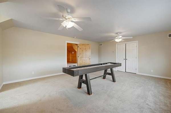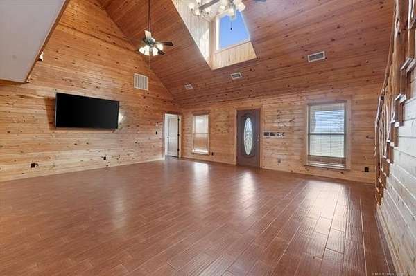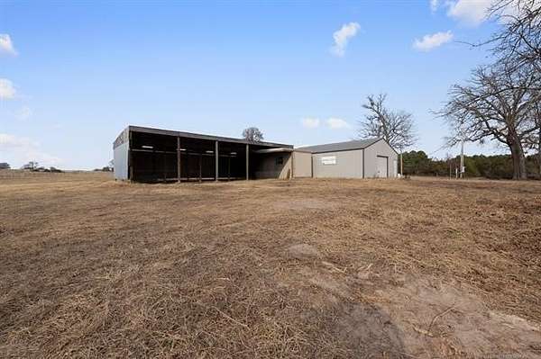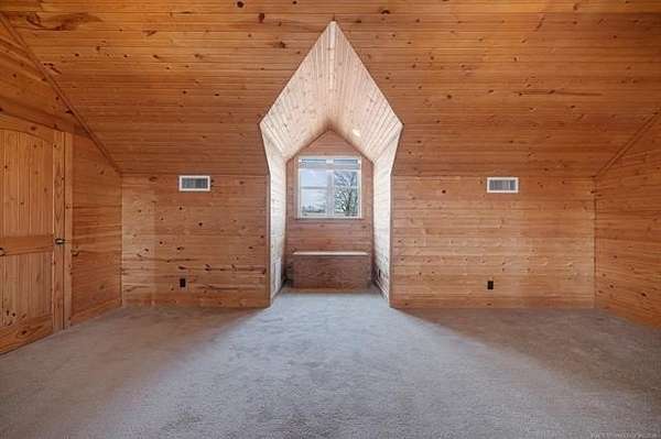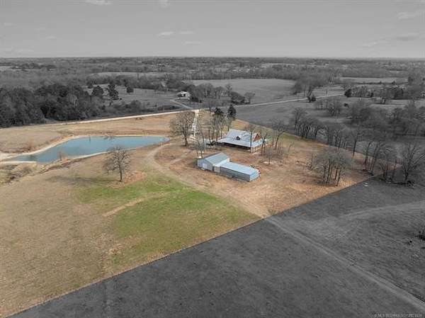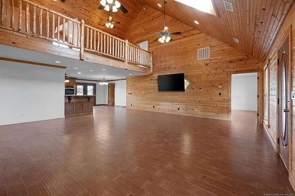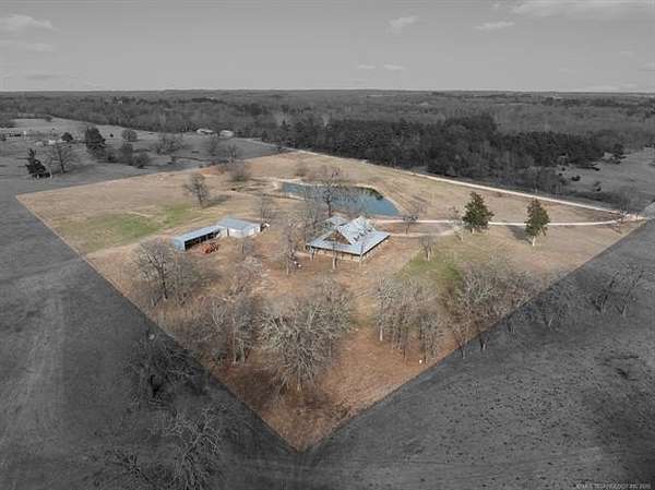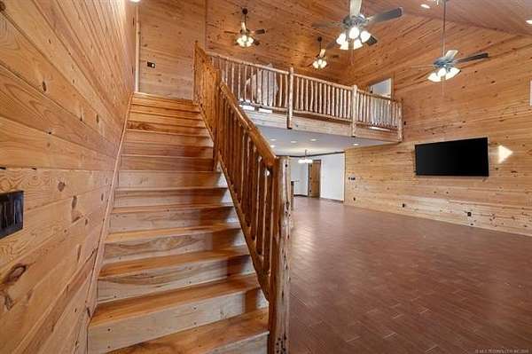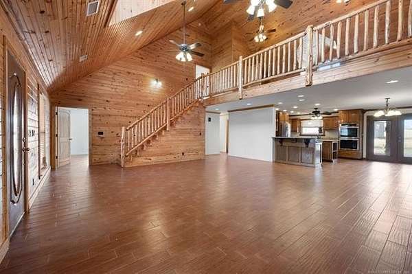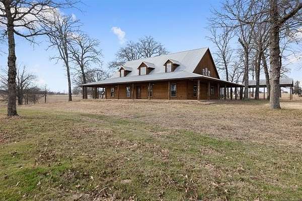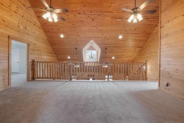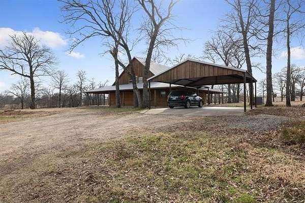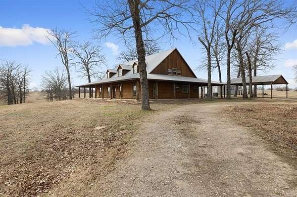 Welcome to a breathtaking retreat where craftsmanship and refined country living meet on 10+/- acres of beautiful land. A long private driveway and stunning wood fence entrance set the tone for this striking two story home with wood exterior and classic tin roof, tucked in a quiet area with excellent neighbors. Inside, soaring vaulted ceilings and gorgeous wood walls, ceilings, and staircase create a warm yet upscale atmosphere. The open concept living area flows seamlessly into a beautifully designed kitchen featuring new stainless appliances, a gas range top, and a spacious island, perfect for entertaining. The interior was repainted in 2023, and new carpet was installed upstairs for a fresh, updated feel. Downstairs offers four bedrooms and two full bathrooms. The primary suite is a luxurious retreat with dual sinks, a custom walk-in shower, and a glamorous air soaking tub, along with a large walk-in closet with abundant shelving. The utility room includes a sink, cabinetry, and freezer space. Upstairs features a large bunk room/fifth bedroom, a game room, bathroom and a balcony overlooking the main living space. The wrap around porch provides stunning views of the massive pond, stocked with bass and catfish four years ago, with bass caught up to seven pounds. Deer can often be seen crossing the property during certain seasons. The 10+/- acres offer privacy and excellent potential for horses or livestock. Improvements include a 20'x50' building with five 10' stalls, a 30'x40' shop plumbed for water, a feed shed, and an insulated well house. Additional features include a new hot water heater in 2025, generator wiring, propane tank, and detached carport. This is more than a home, it is a private estate designed for gathering, recreation, and peaceful living, where every sunset over the pond reminds you why you chose country elegance!