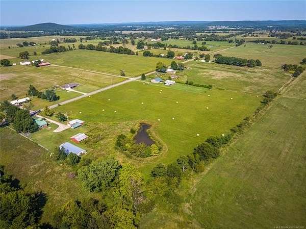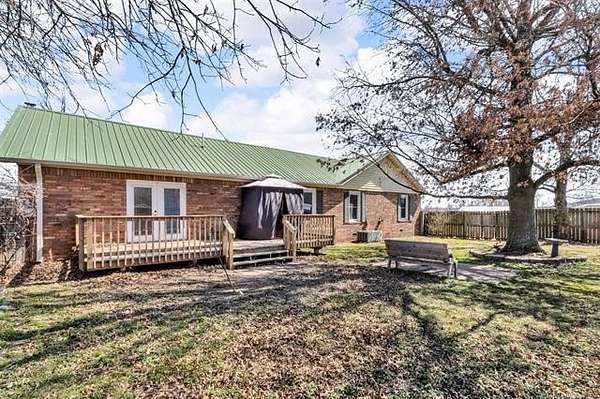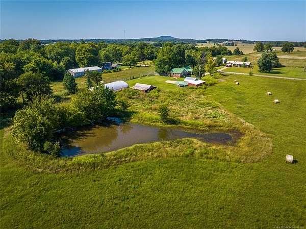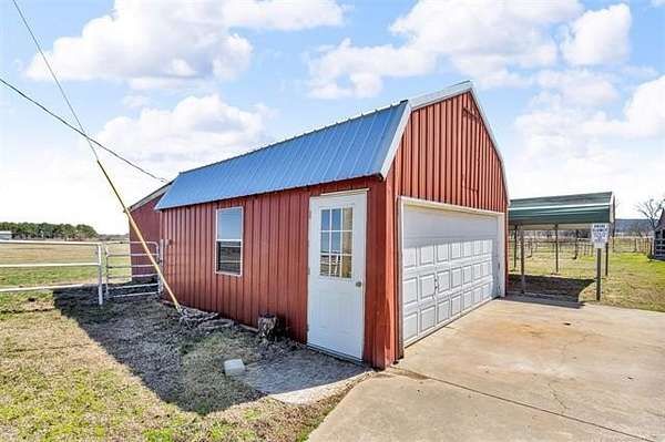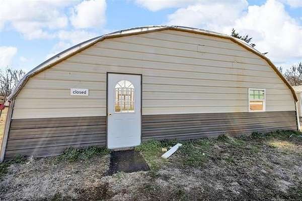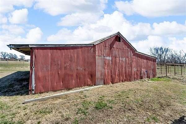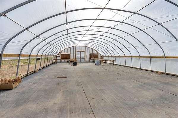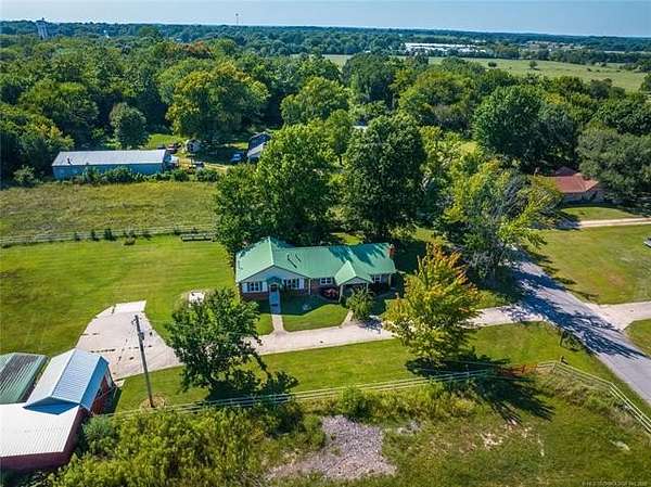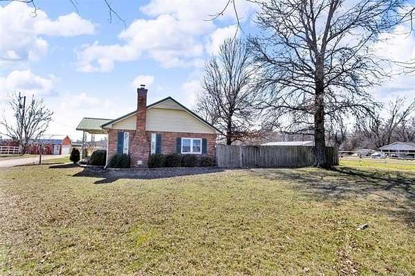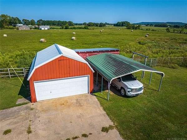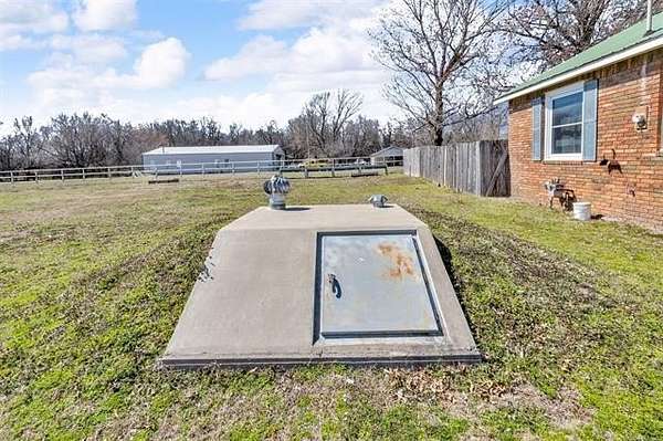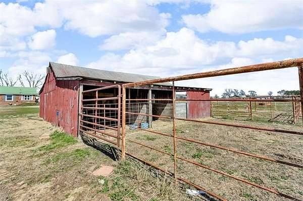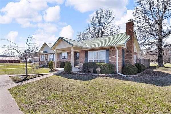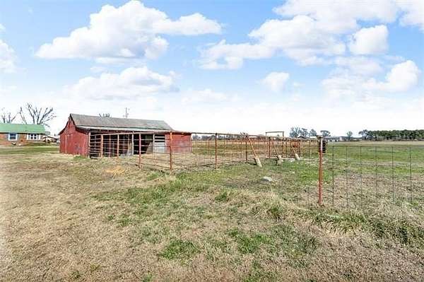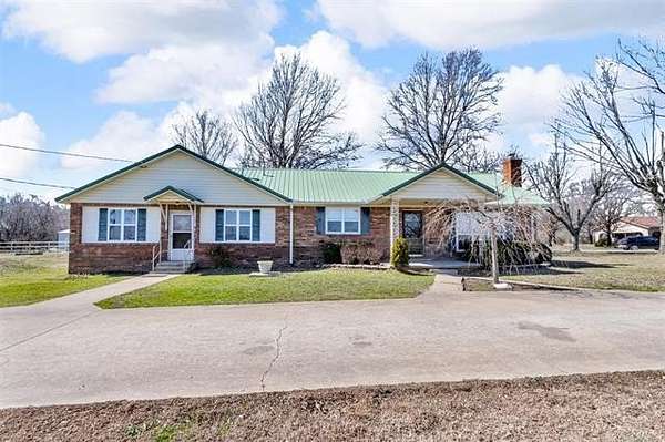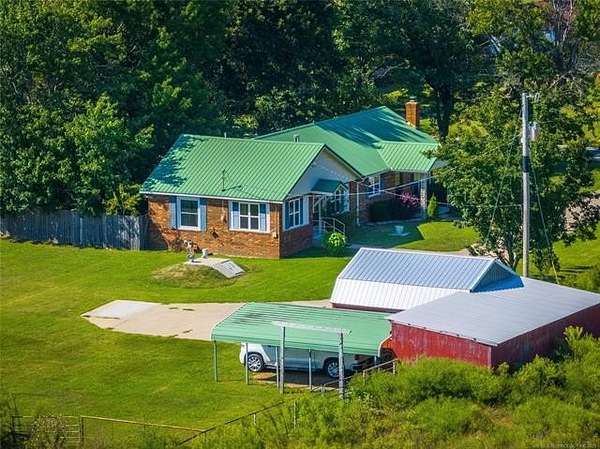 Situated on 9 acres on the outskirts of Westville, Oklahoma, this 3-bedroom, 2-bathroom brick home offers 1,675 square feet of comfortable living space with recent updates, including new flooring and a durable metal roof. The spacious kitchen features classic wood cabinetry, a subway tile backsplash, and ample counter space, while the inviting living room showcases a brick fireplace with built-in cabinetry and large windows for plenty of natural light. The fully fenced and cross-fenced pasture is ideal for livestock, complemented by a barn, corral, multiple storage sheds, and a detached metal garage. A large solid-front greenhouse provides the perfect space for year-round gardening. Additional features are a storm shelter and both well and rural water. This property offers the perfect balance of country charm and functionality, making it an excellent opportunity for those seeking a rural lifestyle with modern conveniences.