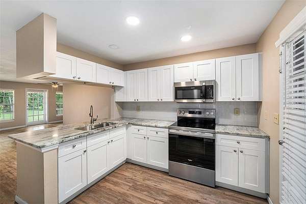 Inside, you'll find a beautifully upgraded kitchen with stunning granite countertops, modern finishes, and a water filtration system for clean, pure water throughout the home. The open living area features hardwood laminate floors throughout the kitchen and living room, creating a warm and inviting space.
