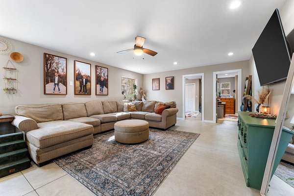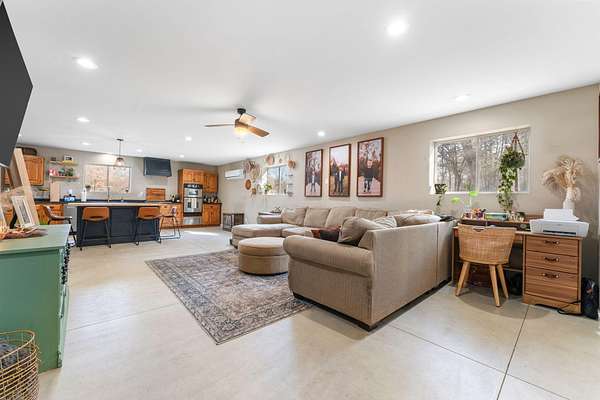 - Ceiling Fan(s), Eat-In Kitchen, Kitchen Island, Open Floorplan, Recessed Lighting