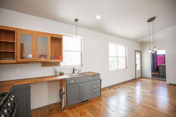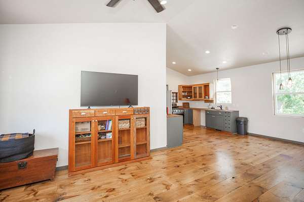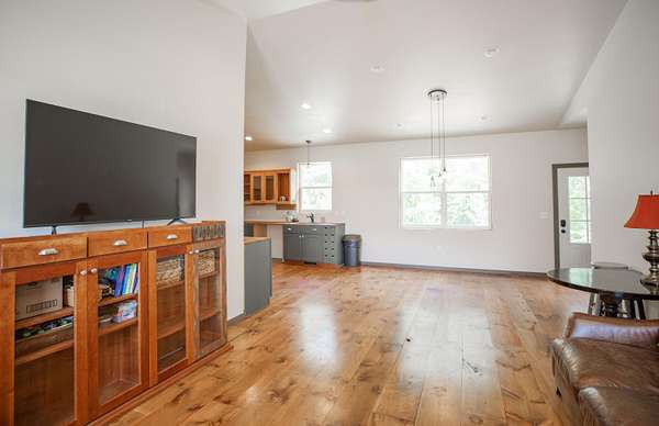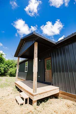 Near new construction sitting at approximately 85% interior completion and ready for the next owner to finish out with personal touches. The home features a solid core build with an attractive black metal exterior and a covered front porch. Interior layout includes three bedrooms, two bathrooms, a dedicated home office, and a spacious open concept kitchen, dining, and living area. High ceilings and generous natural light enhance the living space, while wide plank wood flooring runs through most of the home, adding warmth and character.The nearly 10 acre setting offers a blend of open ground and mature tree cover, creating both privacy and utility. A wet weather creek runs through the property, supporting wildlife and offering potential for future land use, including livestock. Located just outside of Stockton, Missouri, this quiet country setting is accessed by gravel roads and provides the space and pace many are looking for.