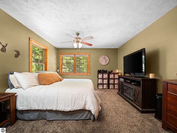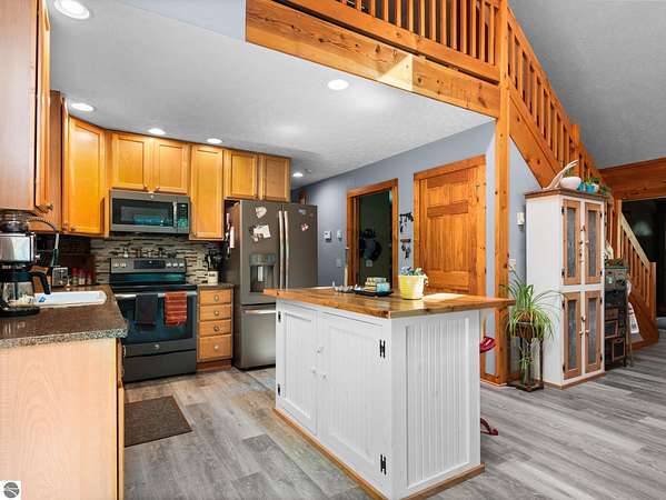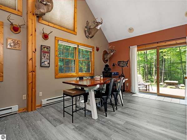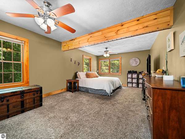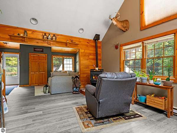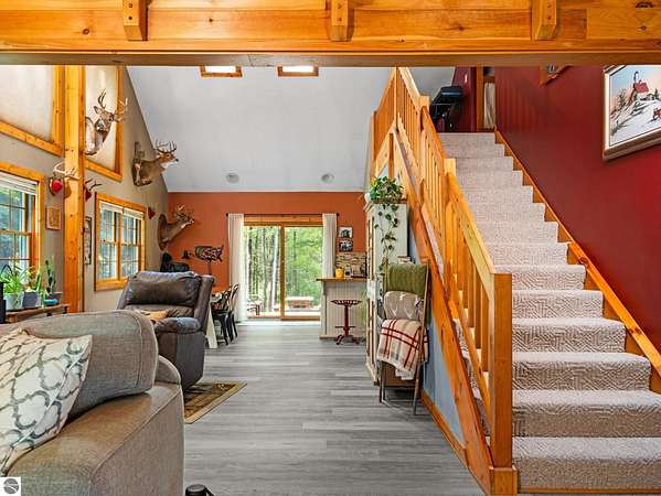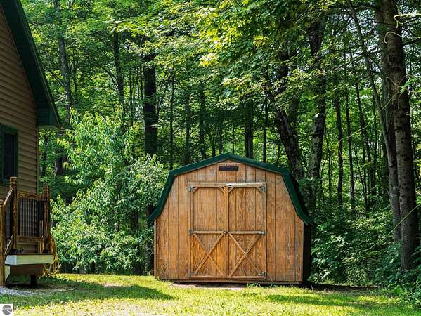 Set back on 20 peaceful acres, this home gives you space, privacy, and freedom, all just 5 minutes from Crystal Mountain. Skiing, golfing, biking, and year-round resort amenities are right down the road, while your own trails and hunting blind bring adventure to your backyard. Inside, the open layout feels inviting and functional. Vaulted ceilings, warm wood accents, and big windows fill the home with natural light. The kitchen flows into the living and dining areas, making it easy to host friends or keep family close while you cook. Outdoors, you’ll find room to live the way you want. Start your morning with coffee on the deck, relax in the hot tub under the trees, or explore your own trails. A spacious pole barn gives you plenty of room for equipment, toys, or hobbies, plus there’s a bonus shed for extra storage. This isn’t just a place to live, it’s where you can spread out, unplug, and enjoy Northern Michigan on your own terms.