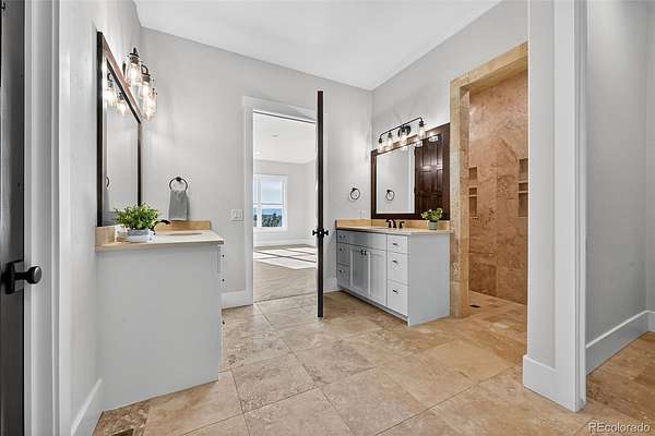 The Master Bedroom Suite features full views of Pikes Peak, double vanities, a Euro-Style step-in shower, soaking tub, and walk-in closet. The 2nd Junior Suite (north side of floor plan) offers guests complete privacy while the 3rd Flex-Room (office, 3rd bedroom, library, gym) has its own entry & exits. The 4+ Bay garage (fits 6 vehicles) and well suited for additional storage. Ample guest parking surrounds the entry to the home