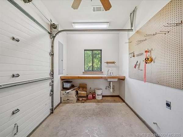 Open concept living room, dining room, and kitchen with gas log fireplace. Double oven w/Jen-aire Range. Floor plan also includes an office area, large pantry/storage area, freezer space, washer/dryer closet, and an inside plant or hobby area with shelving and a work area along with a sink, and overhead door for outside access. Master bedroom has an adjoining bath with 2 sinks, separate shower, jetted bathtub and a combination walk-in closet and safe room. A Jack and Jill bathroom accommodates the 2 additional bedrooms. This home is HANDICAP ACCESSIBLE. The septic aeration system is less than 1 year old. Hot water tank has an instant hot water feature. The refrigerator and washer and dryer to remain with the home. The property also contains a Storage building approximately 15' x 20' on a concrete slab with overhead door, walk-in door, shelving, work bench, and an awning.