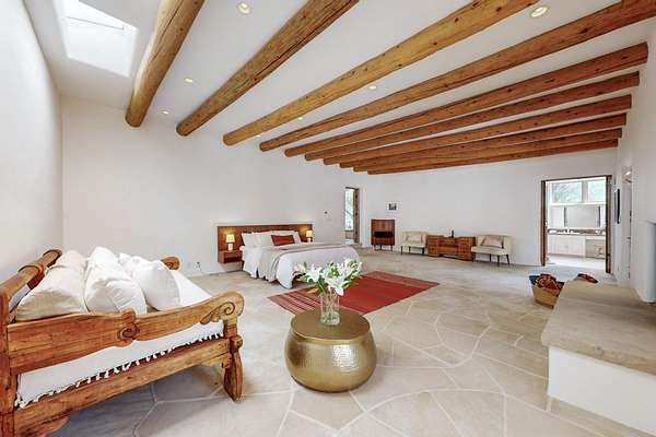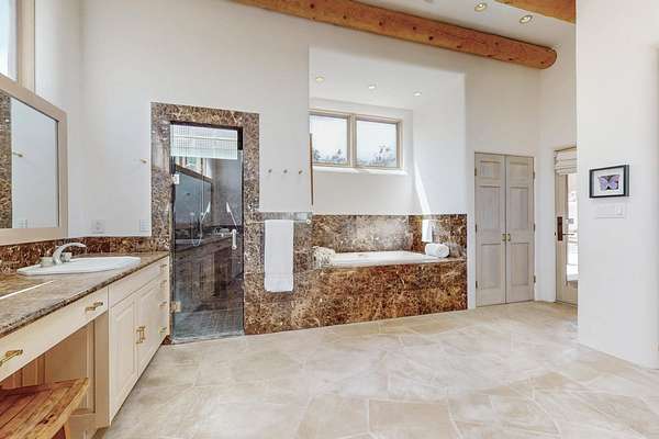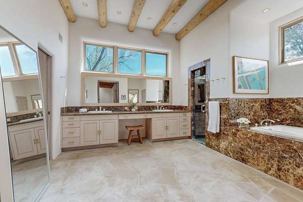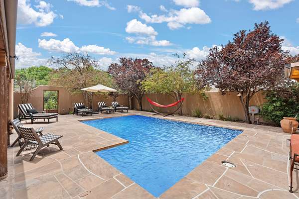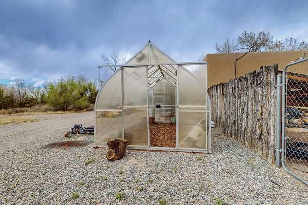 Situated on 2.05 fertile acres in the Nambe Valley lies Casa Alegria. With easy access to both Santa Fe and Los Alamos, this magnificent property boasts authentic Pueblo-style craftsmanship throughout. Surrounding the premiere home on this compound, you'll enjoy courtyards, portals, fireplaces, patios, and landscaped gardens, with mature trees. The interior of this expansive home offers a gourmet kitchen, hardwood and flagstone flooring, viga ceilings, and kiva fireplaces. In its expansive primary bedroom, you'll enjoy a spa bath, walk-in closet, and a spacious patio with its own swimming pool. Additionally, the one-bedroom guesthouse with equally impressive craftsmanship offers a dining area, bathroom, and kitchenette. Adjacent to the oversized 2-car garage is a bonus studio or office space, also with its own bath. Welcome to this spectacular northern New Mexico property.