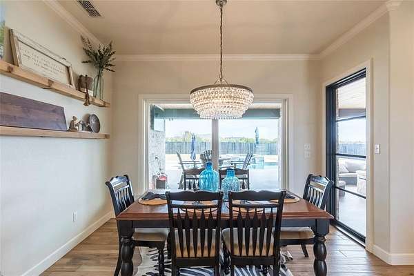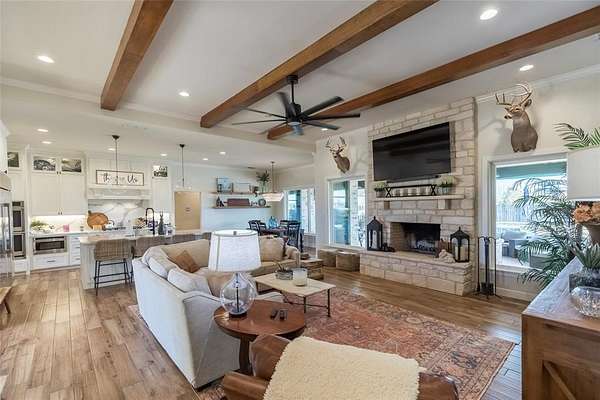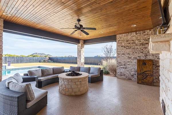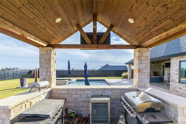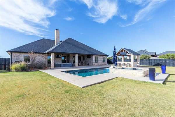 Luxury living meets refined comfort in this exceptional 4-bedroom, 3-bath residence set on 1.69 acres in the highly acclaimed Jim Ned ISD. Designed for both everyday living and elegant entertaining, the open-concept layout is enhanced by engineered hardwood flooring and walls of windows that fill the home with natural light.The living room is a true showpiece, featuring a striking full masonry fireplace with gas starter. The gourmet kitchen is outfitted with quartz countertops, a commercial-grade built-in refrigerator and freezer, gas cooktop, double ovens, and an oversized island ideal for gatherings. A thoughtfully designed butler's pantry with ice maker adds both function and sophistication.The private primary suite offers direct access to the backyard retreat and a spa-inspired bath with tile flooring, soaking tub, tiled walk-in shower, dual vanities, and separate his-and-her closets. The guest wing includes three spacious bedrooms with walk-in closets; two share a Jack-and-Jill bathroom, while a third bath features a beautifully tiled shower. Outdoor living is elevated with meticulously landscaped front and back yards, a circular drive, gutters, and a privacy-fenced backyard oasis. Enjoy resort-style amenities including a swimming pool, hot tub, fire pit, and outdoor kitchen--perfect for hosting or unwinding in total privacy. Additional luxury features include a tankless propane water heater and spray foam insulation for superior energy efficiency and comfort.