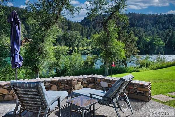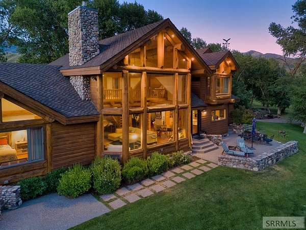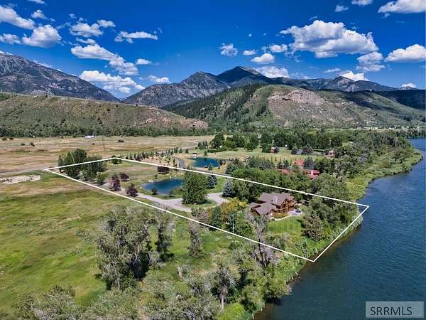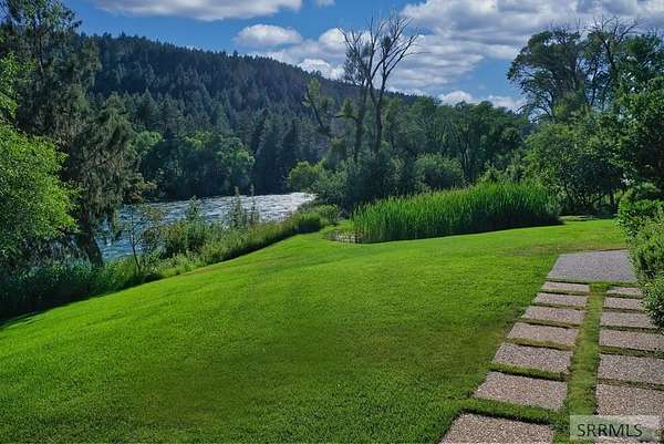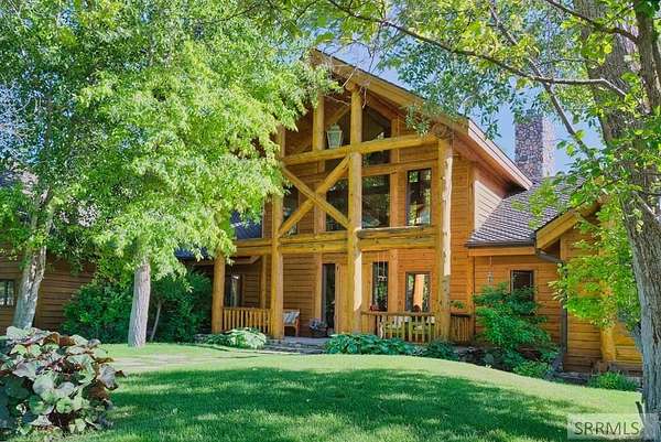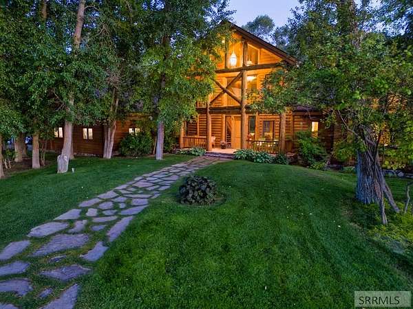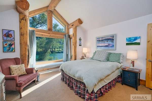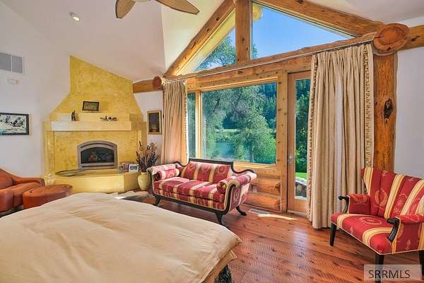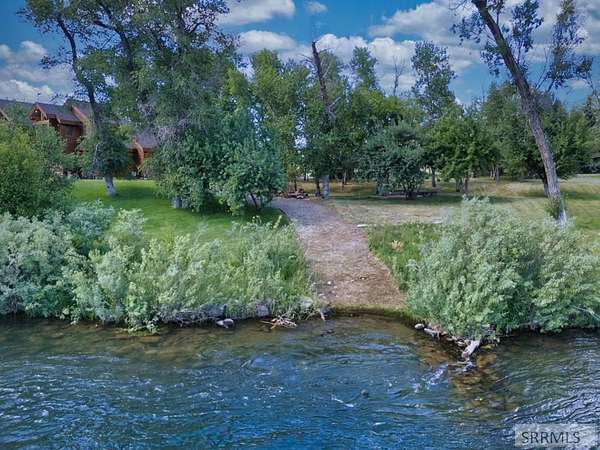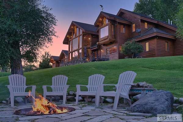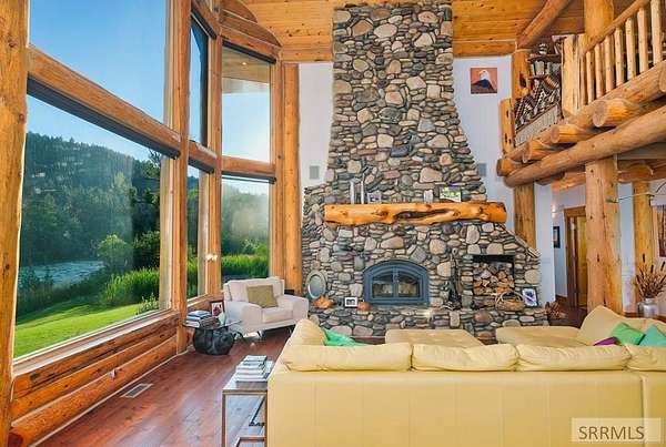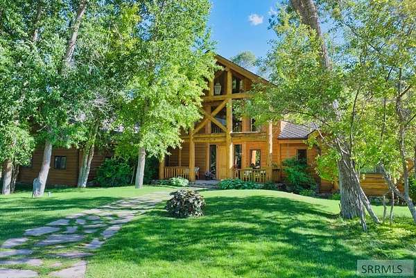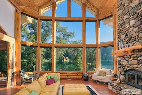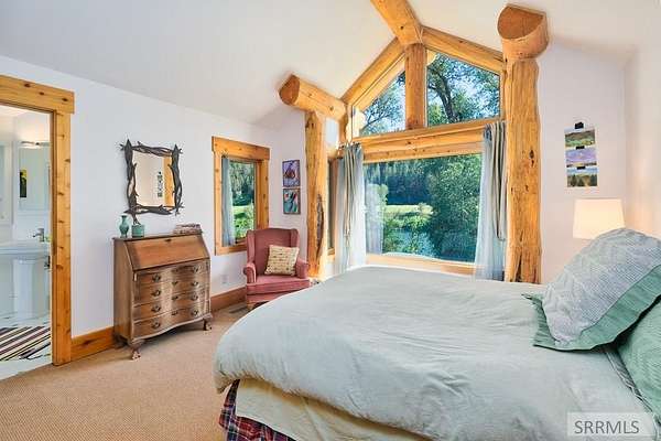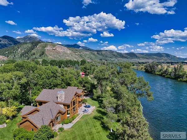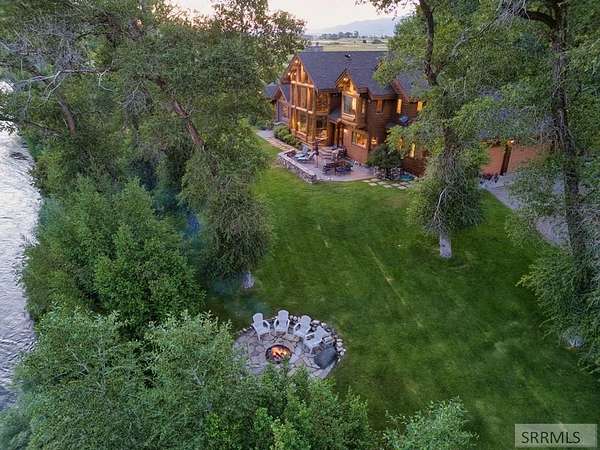 Designed by prominent architect Paul Wuestoff, this riverfront modern home with a western flair offers a unique blend of warmth and sophistication. Located along the banks of the South Fork of the Snake River, world renowned for its exceptional dry fly fishing, the property offers spectacular river views. Enjoy the convenience of a private boat launch, giving you priority access to the water ahead of other boats. Set on 4.5 acres of meticulously landscaped grounds, the estate features mature trees, shrubs, lilacs, a fruitful orchard. A large trout pond with a waterfall connects to a stream leading to a lily pond and a secondary riverfront pond. Step inside this spacious two-story residence featuring 3 bedrooms and 3.5 baths. The large great room is centered around a stunning river rock wood-burning fireplace, expertly crafted by local artist Bill Klobas, adding a unique and artistic touch to the space. An open gourmet kitchen complements the living area. The spacious master bedroom boasts exceptional views overlooking the river A hand-built log staircase leads to the loft with an open-air yoga/art studio a guest suite with a full bath overlooking the river below. Throughout the home, the design thoughtfully balances comfort with natural beauty at every turn.