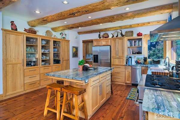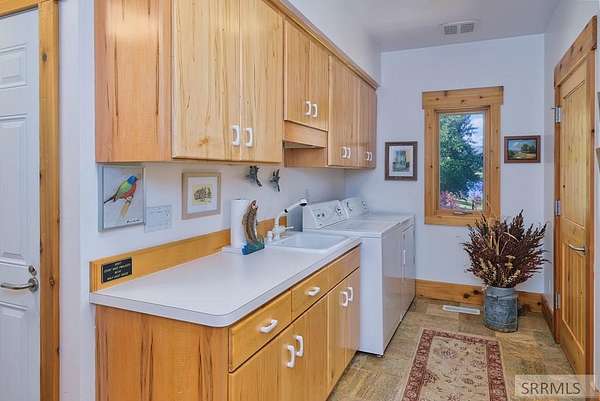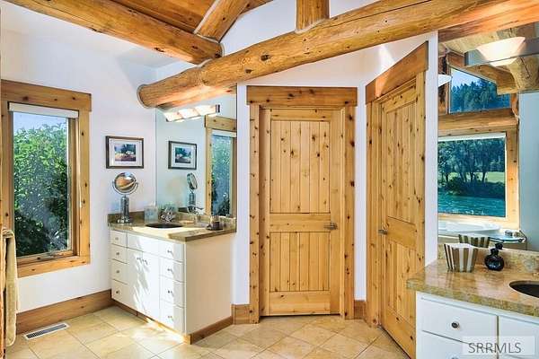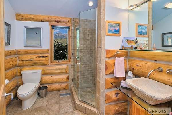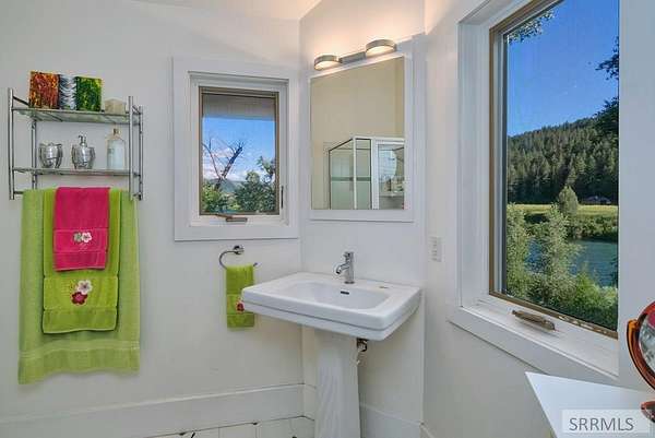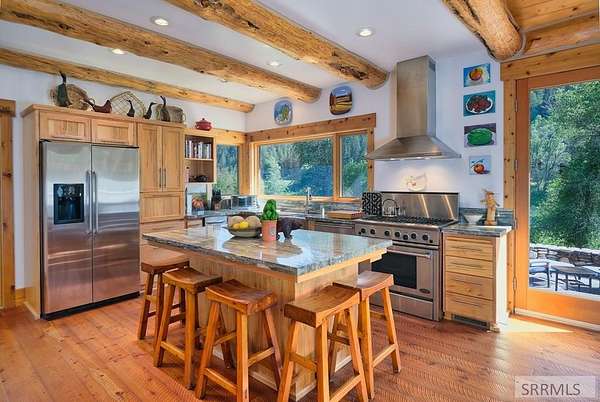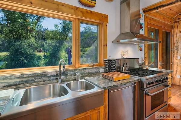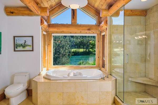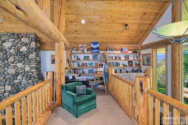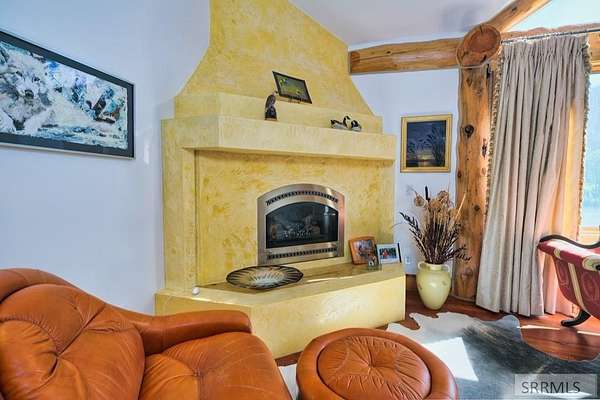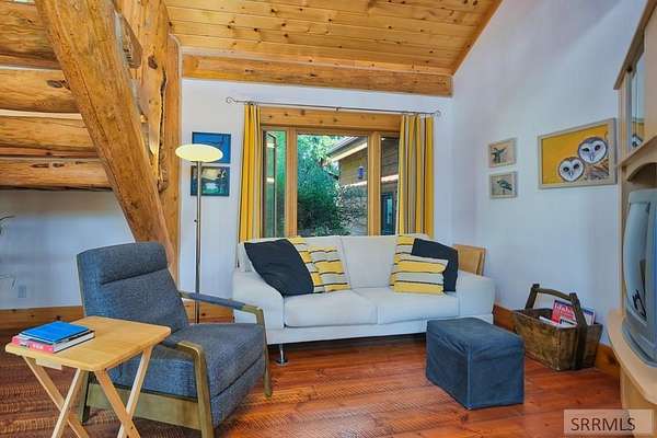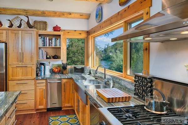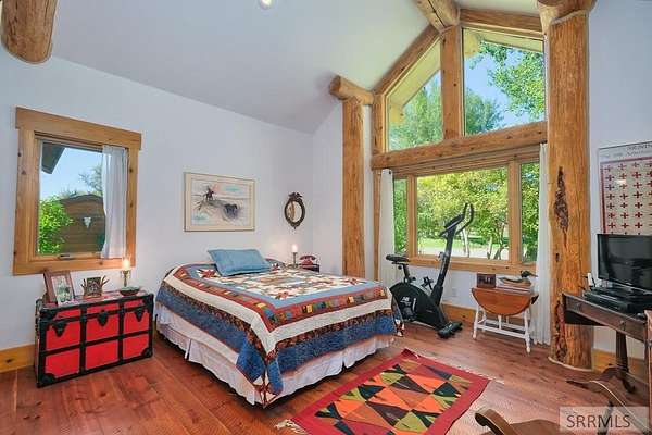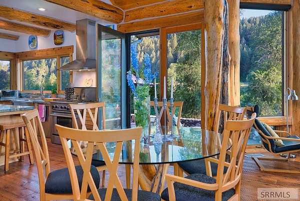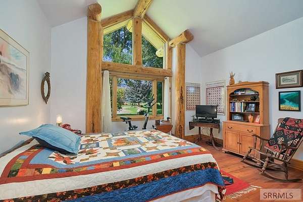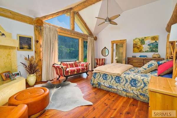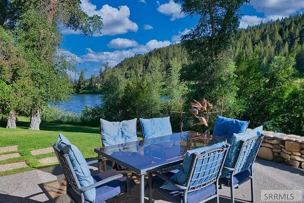 Designed by prominent architect Paul Wuestoff, this riverfront modern home with a western flair offers a unique blend of warmth and sophistication. Located along the banks of the South Fork of the Snake River, world renowned for its exceptional dry fly fishing, the property offers spectacular river views. Enjoy the convenience of a private boat launch, giving you priority access to the water ahead of other boats. Set on 4.5 acres of meticulously landscaped grounds, the estate features mature trees, shrubs, lilacs, a fruitful orchard. A large trout pond with a waterfall connects to a stream leading to a lily pond and a secondary riverfront pond. Step inside this spacious two-story residence featuring 3 bedrooms and 3.5 baths. The large great room is centered around a stunning river rock wood-burning fireplace, expertly crafted by local artist Bill Klobas, adding a unique and artistic touch to the space. An open gourmet kitchen complements the living area. The spacious master bedroom boasts exceptional views overlooking the river A hand-built log staircase leads to the loft with an open-air yoga/art studio a guest suite with a full bath overlooking the river below. Throughout the home, the design thoughtfully balances comfort with natural beauty at every turn.