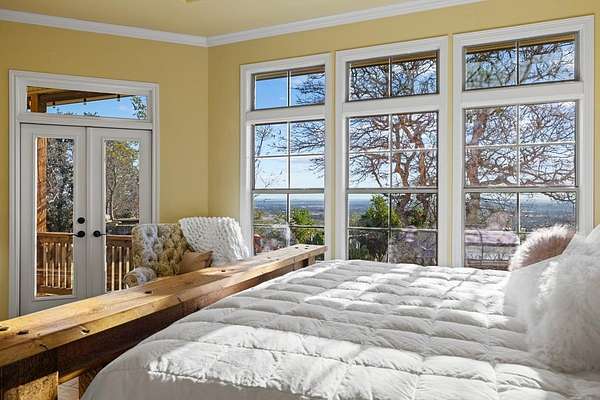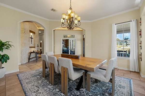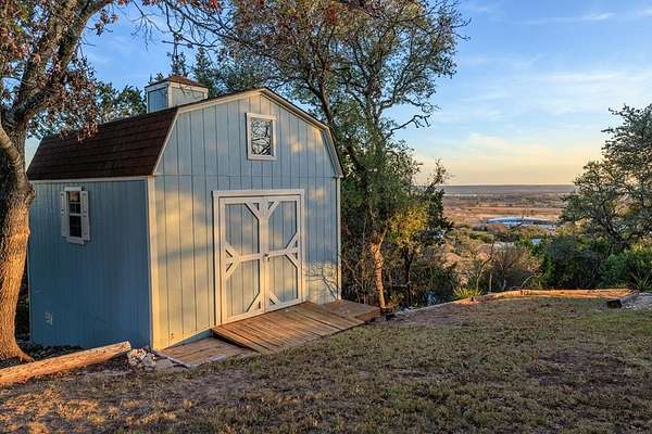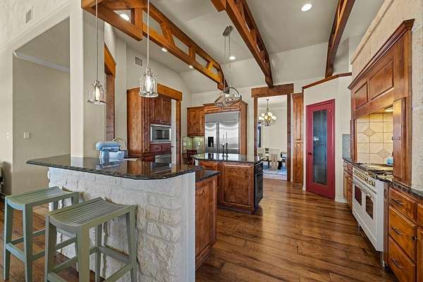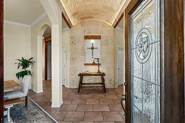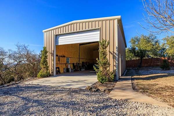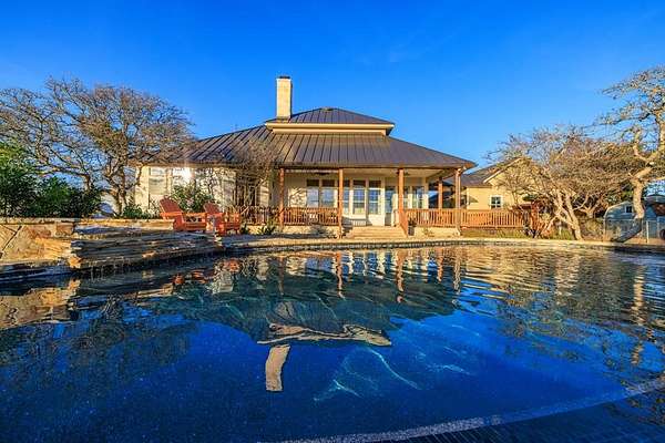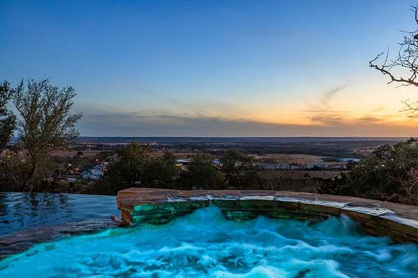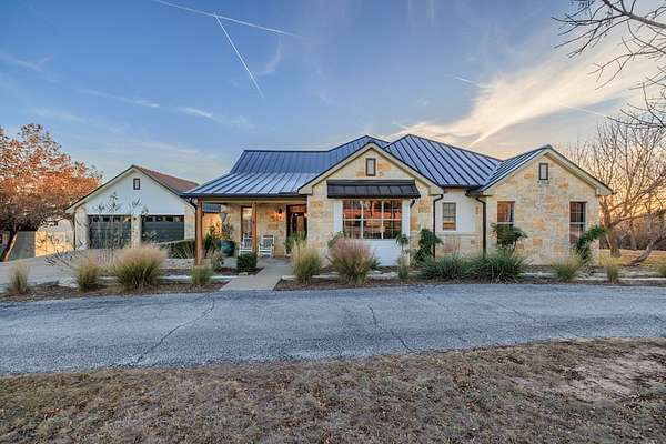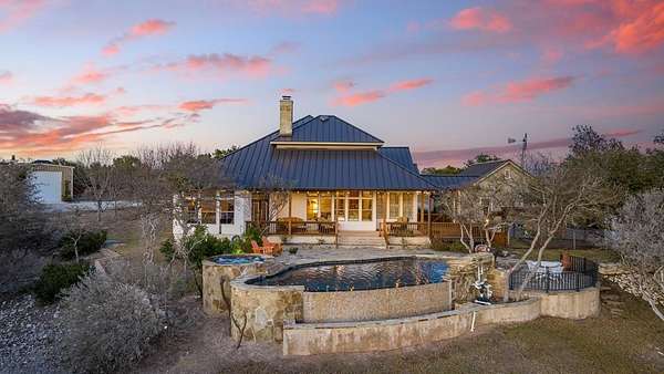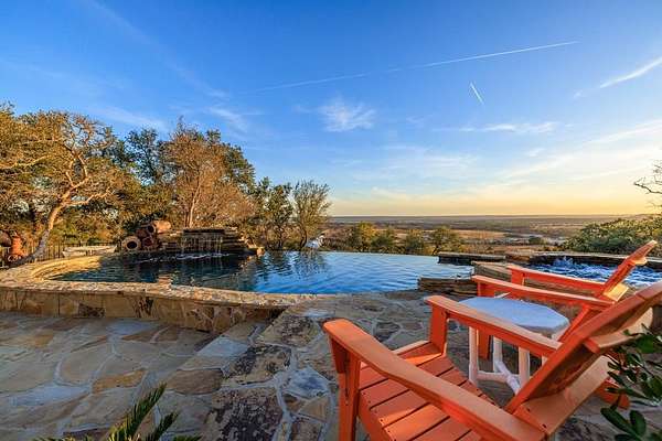 Hilltop property with spectacular Hill Country views just minutes from downtown Fredericksburg. This thoughtfully designed custom Hill Country home sits on 4.935 private acres and offers 4 bedrooms, 3 bathrooms, fourth bedroom can easily be used as a study/office. The front foyer, with its dramatic hand crafted barrel-ceiling, opens to a formal dining area and private office featuring custom knotty alder cabinetry. A chef's kitchen features granite countertops with handcarved edges, a Hallman Italian gas range with dual ovens, Bosch dishwasher, GE Monogram refrigerator/freezer, large island, knotty alder cabinetry and exposed solid cedar beams. The great room showcases soaring 20-foot ceilings, floor-to-ceiling windows, and a stone fireplace with mesquite mantle overlooking expansive, breathtaking views. The private primary suite includes patio access, dual vanities, whirlpool tub, walk-in shower, expansive walk-in closet and additional bonus room than can be used as an attached gym, office or additional walk-in closet. Outdoor covered patio overlooks a heated infinity-edge pool, hot tub, and spacious entertaining patios. Additional highlights include gated entry, oversized garage, 1,250 sq ft RV building (25x50) and outbuilding. There are additonal building sites on the property with easy access to water/electricity and septic. One site sits on the opposite end of the property and would be perfect for a guest house or B&B with electricity, water and its own roadside access. Several recent improvements completed in 2025 include fresh interior/exterior paint, new metal seam roof/gutters, double pane windows, insulated garage doors and new water heater. Thoughtfully built for comfort, privacy, and everyday luxury in one of Fredericksburg's most scenic settings.