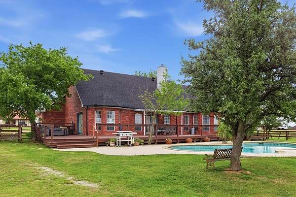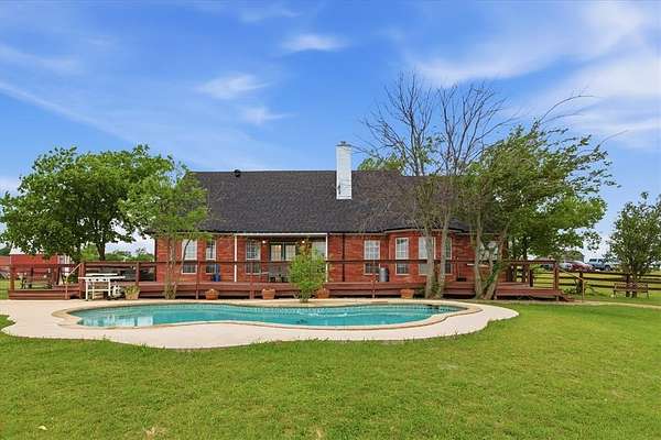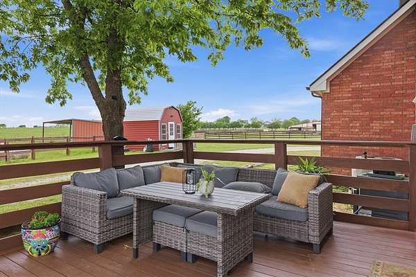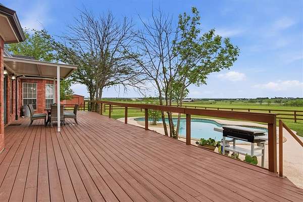 Step outside to your private backyard oasis complete with a sparkling pool and an expansive 72x27 deck, perfect for hosting gatherings or enjoying quiet country sunsets. The property is fully equipped for rural living with a barn, private water well, and storm shelter—ideal for Texas weather.