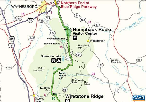 From Sherando Lake Recreation Area Mt. Torrey Rd (St Rte 664) straight onto State Rte 814 3.8 mi Turn right onto Blue Ridge Pkwy 0.6 mi Sharp left at mailbox (16903 Blue Ridge Pkwy) down 0.3 mi gravel driveway
