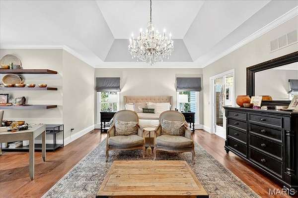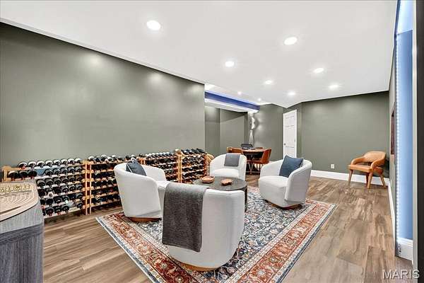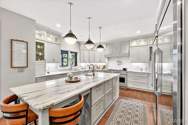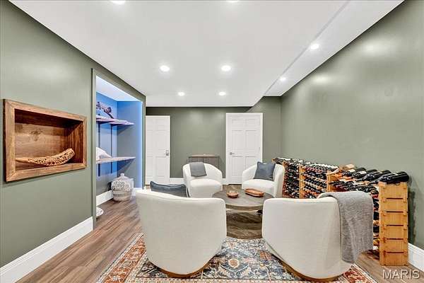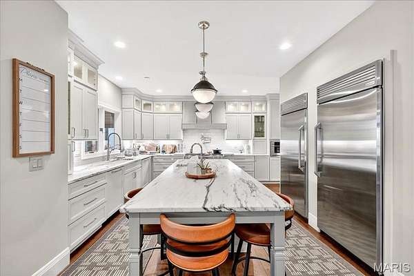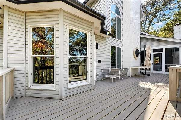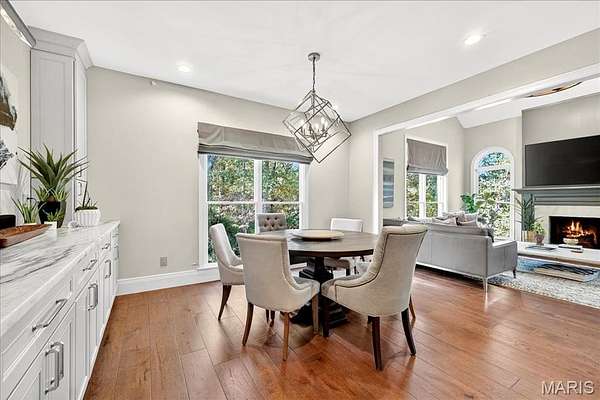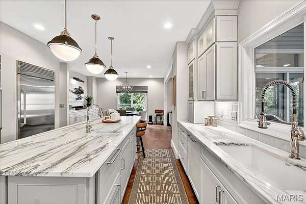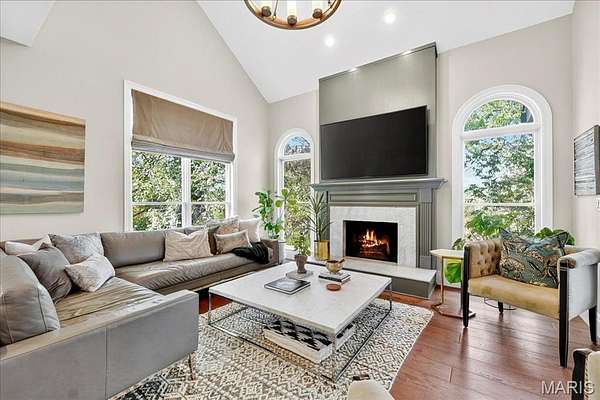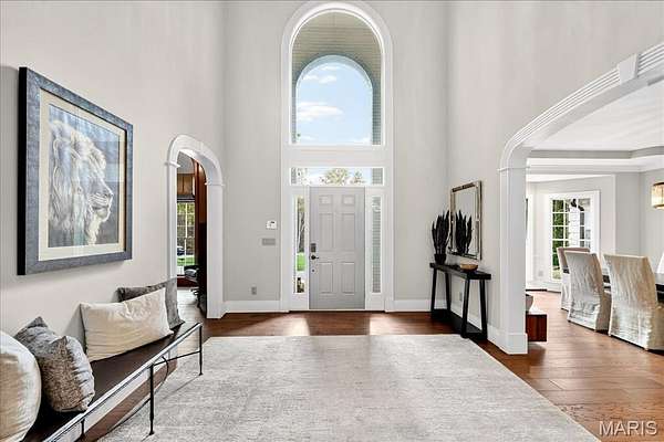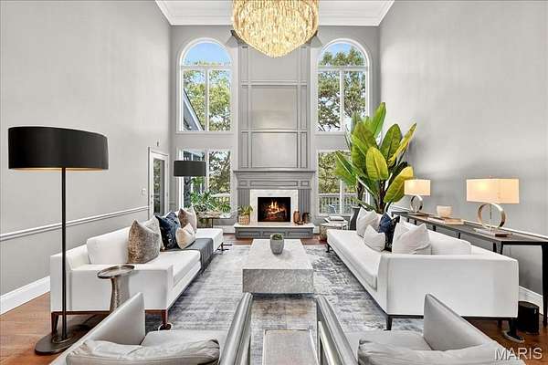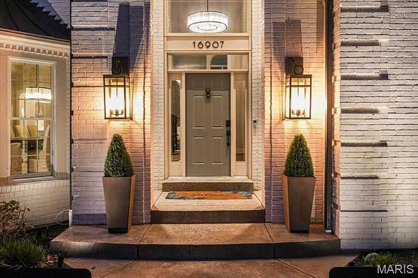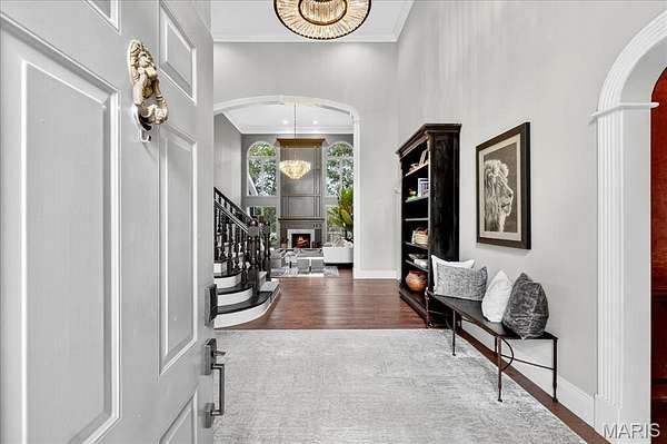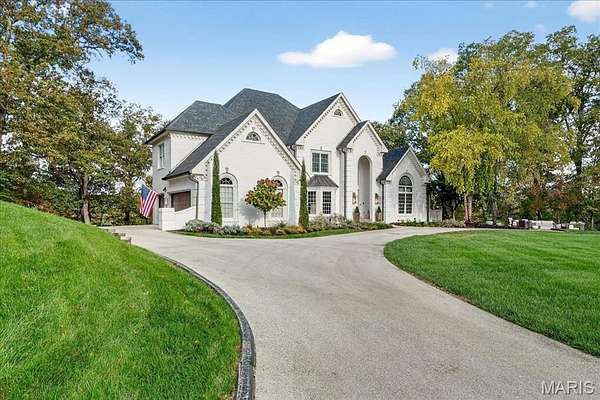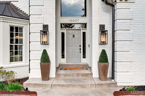 Privately positioned at the end of a cul-de-sac in the coveted Lewis Spring Farms subdivision, this extraordinary five-bedroom, four-and-a-half-bathroom estate sits on just over three acres of sculpted landscape and offers more than 8,400+ square feet of fully renovated, designer-curated interiors that deliver modern, bespoke elegance amid woodland seclusion. Redesigned entry garden anchored by a sculptural fountain guides you inside, where a dramatic two-story foyer welcomes you. Gleaming hardwood flooring carries throughout the main and upper levels, arched doorways with custom moulding frame every sightline, and a cohesive designer lighting package featuring Restoration Hardware chandeliers and Hinkley architectural fixtures adds layered warmth and emphasis throughout. The richly appointed study is wrapped in warm natural wood and showcases custom built-ins, a soaring vaulted ceiling with a statement chandelier, and an expansive arched window. The formal dining room impresses with a coffered ceiling, bay-window views, and effortless flow for gatherings from intimate dinners to holiday celebrations. The stately, two-story living room is anchored by a newly designed honed marble gas fireplace and hearth, flanked by floor-to-ceiling windows that frame serene wooded views, while custom millwork and refined signature lighting complete the composition. At the heart of the home, a newly reimagined chef’s kitchen shines with custom Shiloh cabinetry and Danby marble surfaces met with a professional, built-in stainless appliance suite: GE Monogram refrigerator with companion freezer, GE Café double oven and range with custom vented hood, two sets of refrigerator drawers, two fully integrated dishwashers, built-in microwave, and a Scotsman ice maker, engineered for prep-to-party perfection. The adjoining Hearth Room features a second honed-marble gas fireplace with easy connection to the screened porch and breakfast room. The main-floor primary suite offers a private sanctuary complete with coffered ceilings, layered chandelier lighting, and bay windows opening to a private deck. The spa-inspired ensuite features dual vanities with lighted mirrors, Vicostone Quartz countertops, a frameless glass steam shower with integrated speakers, a separate soaking tub, and two boutique-style walk-in closets. Upstairs, three spacious bedrooms, all with walk-in closets, custom built-in shelving, and ensuite bathroom access, surround a versatile loft area suited for movie nights, games, or a cozy family lounge. The finished lower level expands your entertaining space and steps out to a spacious lower-level deck with peaceful outlooks, while the main family area delivers herringbone LVP floors, plush carpeting, a third honed-marble fireplace and hearth, and a granite-topped wet bar with a dedicated wine refrigerator. Off the main gathering space, the Poker & Pinot room delivers a tailored hideaway with custom-cut natural-wood shelving and an ambiance made for grown-up gatherings. Completing the level are a fifth bedroom, a renovated full bath, and a dedicated gym. Outdoors, sweeping lawns dissolve into woodland privacy as landscape lighting turns dusk into a show and a new Restoration Hardware gas fire pit gathers friends beneath the canopy. An extended driveway leads to a three-car garage and circular motor court, completing the estate’s polished presentation. Perfectly positioned on the Wildwood/Chesterfield border in the Rockwood School District, the estate sits minutes from Chesterfield Valley, Wildwood Town Center, and Future Downtown Chesterfield, marrying sophistication, privacy, and everyday convenience. 16907 Lewis Spring Farms Road stands as a testament to thoughtful design and careful execution: every detail refined, every upgrade purposeful, every space created to elevate how you live.