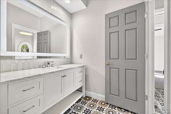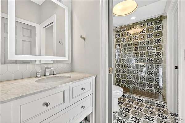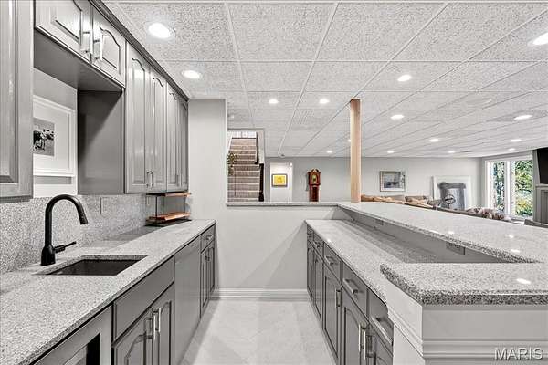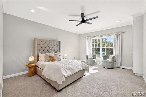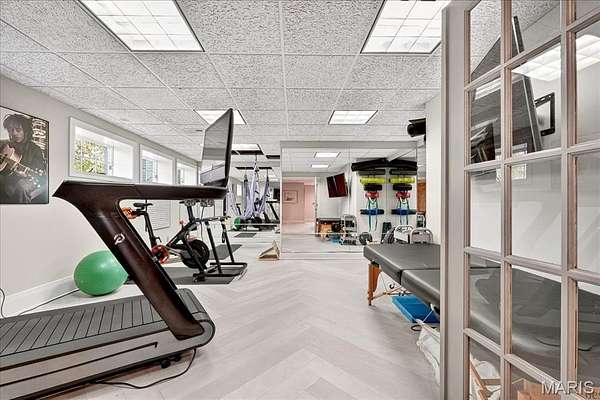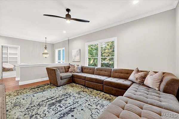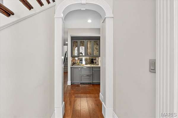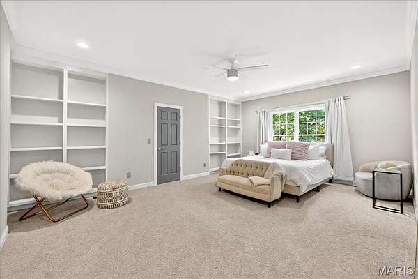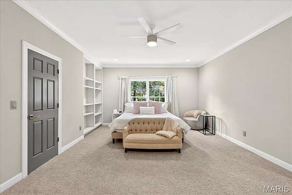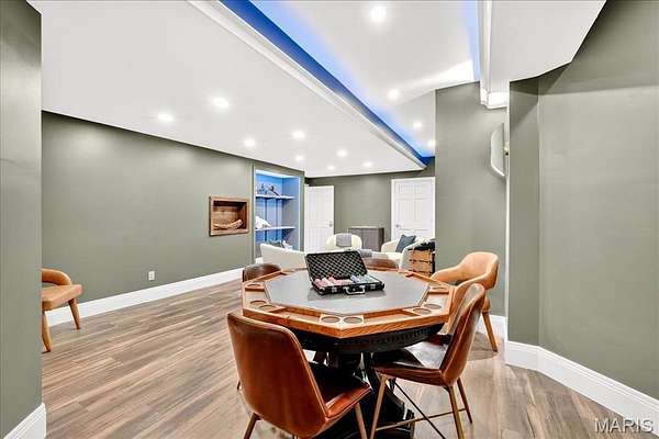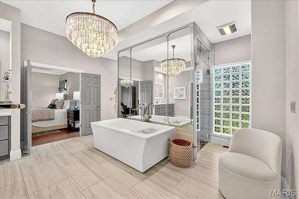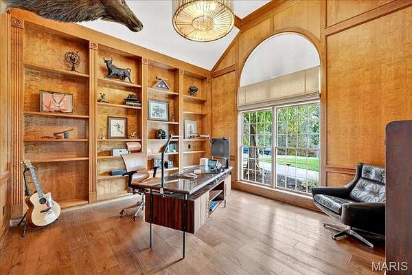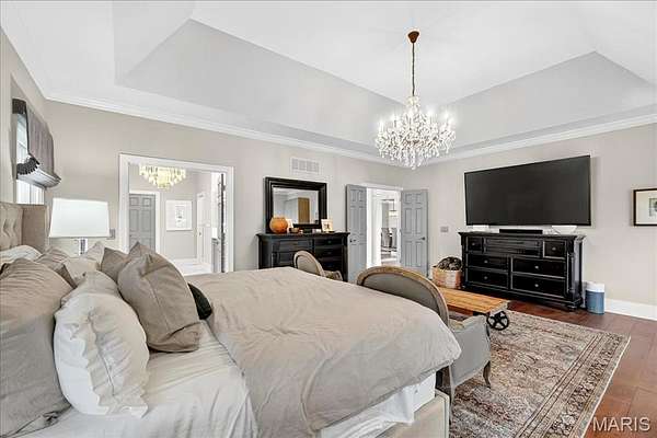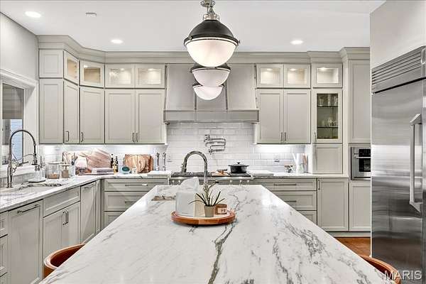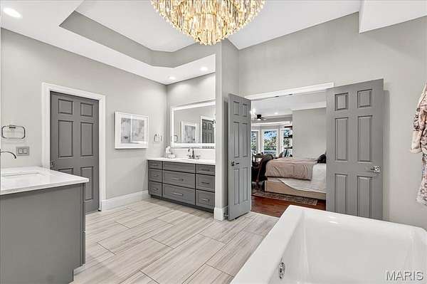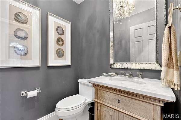 Privately positioned at the end of a cul-de-sac in the coveted Lewis Spring Farms subdivision, this extraordinary five-bedroom, four-and-a-half-bathroom estate sits on just over three acres of sculpted landscape and offers more than 8,400+ square feet of fully renovated, designer-curated interiors that deliver modern, bespoke elegance amid woodland seclusion. Redesigned entry garden anchored by a sculptural fountain guides you inside, where a dramatic two-story foyer welcomes you. Gleaming hardwood flooring carries throughout the main and upper levels, arched doorways with custom moulding frame every sightline, and a cohesive designer lighting package featuring Restoration Hardware chandeliers and Hinkley architectural fixtures adds layered warmth and emphasis throughout. The richly appointed study is wrapped in warm natural wood and showcases custom built-ins, a soaring vaulted ceiling with a statement chandelier, and an expansive arched window. The formal dining room impresses with a coffered ceiling, bay-window views, and effortless flow for gatherings from intimate dinners to holiday celebrations. The stately, two-story living room is anchored by a newly designed honed marble gas fireplace and hearth, flanked by floor-to-ceiling windows that frame serene wooded views, while custom millwork and refined signature lighting complete the composition. At the heart of the home, a newly reimagined chef’s kitchen shines with custom Shiloh cabinetry and Danby marble surfaces met with a professional, built-in stainless appliance suite: GE Monogram refrigerator with companion freezer, GE Café double oven and range with custom vented hood, two sets of refrigerator drawers, two fully integrated dishwashers, built-in microwave, and a Scotsman ice maker, engineered for prep-to-party perfection. The adjoining Hearth Room features a second honed-marble gas fireplace with easy connection to the screened porch and breakfast room. The main-floor primary suite offers a private sanctuary complete with coffered ceilings, layered chandelier lighting, and bay windows opening to a private deck. The spa-inspired ensuite features dual vanities with lighted mirrors, Vicostone Quartz countertops, a frameless glass steam shower with integrated speakers, a separate soaking tub, and two boutique-style walk-in closets. Upstairs, three spacious bedrooms, all with walk-in closets, custom built-in shelving, and ensuite bathroom access, surround a versatile loft area suited for movie nights, games, or a cozy family lounge. The finished lower level expands your entertaining space and steps out to a spacious lower-level deck with peaceful outlooks, while the main family area delivers herringbone LVP floors, plush carpeting, a third honed-marble fireplace and hearth, and a granite-topped wet bar with a dedicated wine refrigerator. Off the main gathering space, the Poker & Pinot room delivers a tailored hideaway with custom-cut natural-wood shelving and an ambiance made for grown-up gatherings. Completing the level are a fifth bedroom, a renovated full bath, and a dedicated gym. Outdoors, sweeping lawns dissolve into woodland privacy as landscape lighting turns dusk into a show and a new Restoration Hardware gas fire pit gathers friends beneath the canopy. An extended driveway leads to a three-car garage and circular motor court, completing the estate’s polished presentation. Perfectly positioned on the Wildwood/Chesterfield border in the Rockwood School District, the estate sits minutes from Chesterfield Valley, Wildwood Town Center, and Future Downtown Chesterfield, marrying sophistication, privacy, and everyday convenience. 16907 Lewis Spring Farms Road stands as a testament to thoughtful design and careful execution: every detail refined, every upgrade purposeful, every space created to elevate how you live.