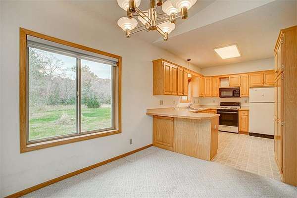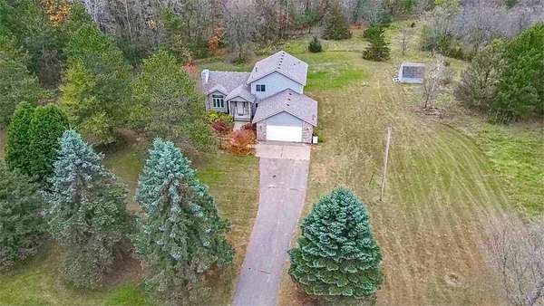 Enjoy peaceful living on five private acres, nestled along a quiet street surrounded by nature. The main level offers a welcoming living room, informal dining area, and kitchen. Vaulted ceilings and a gas fireplace add warmth and character to the living space. The sliding glass door off the dining area provides easy access to the yard and the kitchen window frames tranquil views. Upstairs is a full bathroom and three bedrooms, including a primary bedroom with a spacious walk-in closet. The walk-out lower level includes a three-quarter bath, along with a large unfinished area and an additional unfinished room, perfect for customizing to your needs. The yard features a lawn and garden shed offering easy access to equipment, as well as storage. This one-owner home features a new roof (2025).