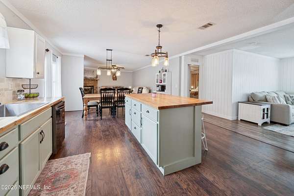 Inside, you'll find 4 generously sized bedrooms and 3 full bathrooms, and THREE separate living spaces, one that is ideal for a playroom/home gym. The cozy living room features a wood burning fireplace, while the large kitchen has an island, butcher block counter tops, farm sink, ample cabinetry, and a walk in pantry making it perfect for everyday living and entertaining.