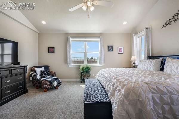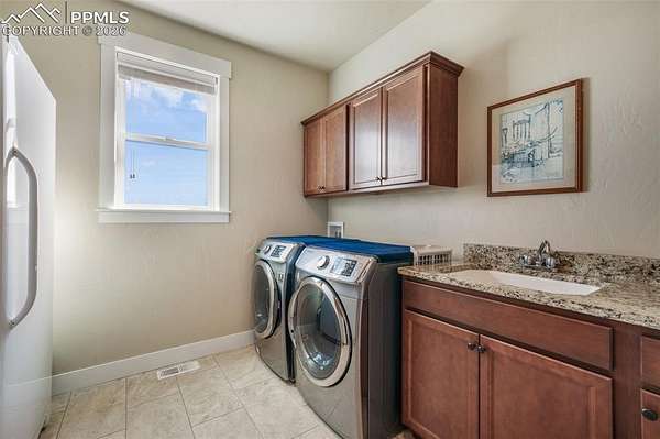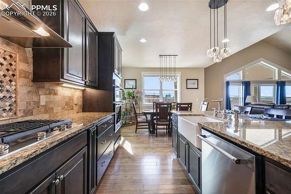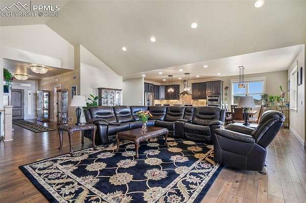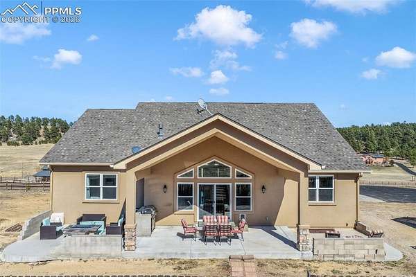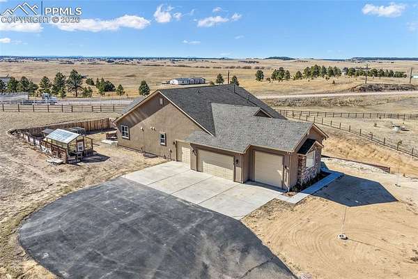 Nestled in a quiet cul-de-sac on nearly 4.5 acres, this immaculately maintained ranch style home with a finished walkout basement offers space, comfort, and exceptional quality throughout. Pikes Peak views, stunning natural light, hand troweled walls, hardwood floors in main living areas, upgraded Pottery Barn light fixtures, and soft-close cabinetry elevate the home's warm, inviting feel. The kitchen features stainless steel KitchenAid appliances including a wall oven, convection microwave, dishwasher, refrigerator, and gas range with hood, plus granite counters, upgraded cabinetry, a large island with single basin sink, and a walk in pantry with wood shelves. The living room is anchored by a gas fireplace with a beautiful mantle and granite hearth. The spacious primary suite includes a luxurious ensuite with dual vanities, an expansive shower with dual shower heads, tile to the ceiling and frameless glass door, a freestanding soaking tub, and a walk in closet customized by California Closets. In addition to the powder room, there is a full hall bathroom and 2 additional main level bedrooms with huge closets. The laundry room includes cabinetry, single basin utility sink, granite counters and the washer and dryer are included. The finished walkout basement is ideal for entertaining or multigenerational living with three massive secondary bedrooms with walk in closets, two full bathrooms, a large family room/rec room with pool table and shuffleboard, and an incredible bar with sink, abundant cabinetry, and granite counters. Outside, enjoy the west facing covered poured concrete patio spanning the width of the home, an asphalt driveway, oversized 4 car garage with an extended height bay door, chicken coop, greenhouse and split rail fencing along the perimeter. Dependable high speed fiber optic internet and Wi-Fi are available. Less than 10 mins to Peyton schools and 15 mins to King Soopers, Walmart and dining. Approximately 15 mins to Hwy 83 and 25 mins to I-25.