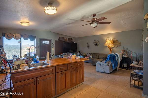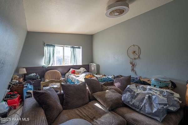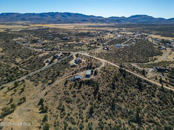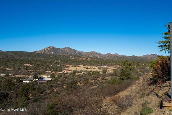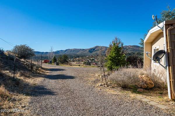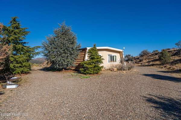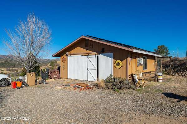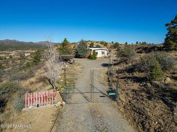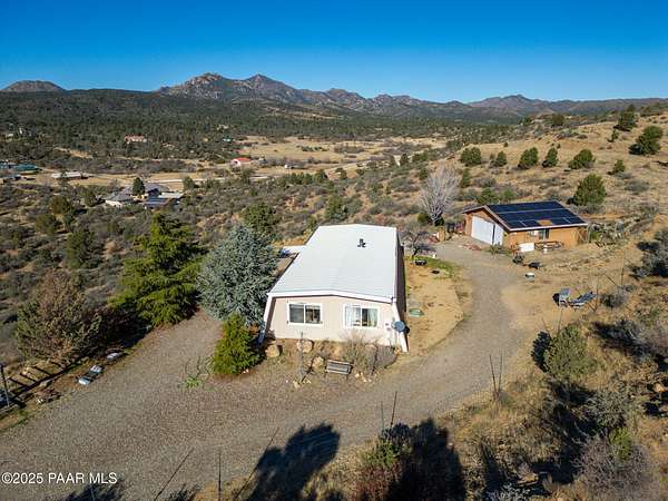Enjoy a peaceful hilltop living in this cute and unique 2-bedroom, 1-bath Peeples Valley home on 2.5 private acres. Thoughtfully designed with a metal roof and 8'' deep walls to stays cool in summer and warm in winter. Oversized windows flood the living and dining areas with natural light and showcase spectacular mountain views, also enjoyed from the covered front patio perfect for your morning coffee. Perimeter fencing surrounds the home to keep your 4 legged friends safe, detached 2-car garage can be used as a workshop or storage, and unmatched privacy make this a true retreat. This great home will go quick, schedule a showing today!