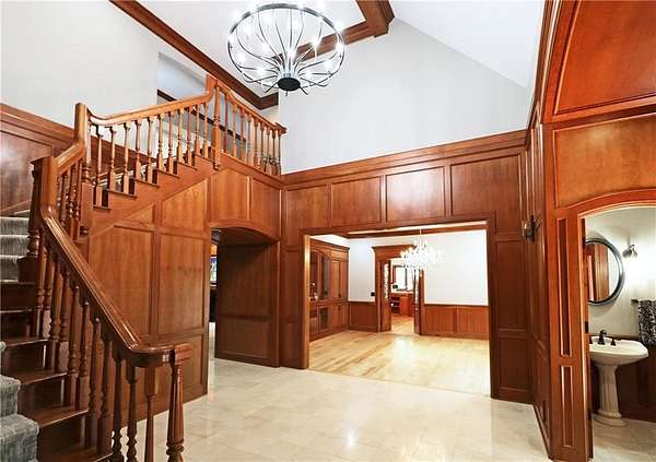 Lower-level: large family/entertainment area (big stone fb, lakeview, built-ins), wet-bar, climate-controlled wine cellar, office/hobby rm, gym/exercise rm, full bath w/ sauna & steam shower, in-ground safe, & lots of space in the unfinished basement to finish or use as storage.