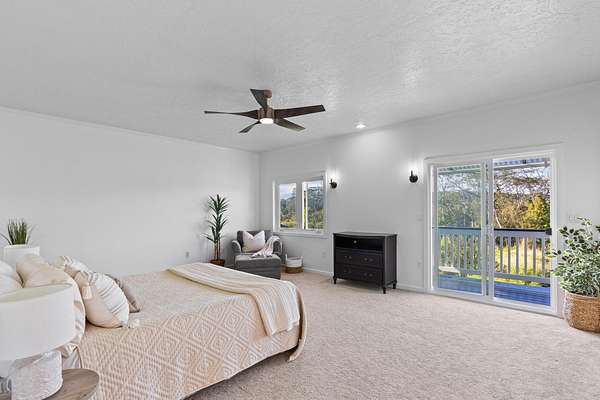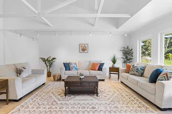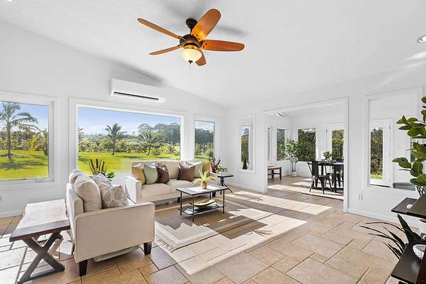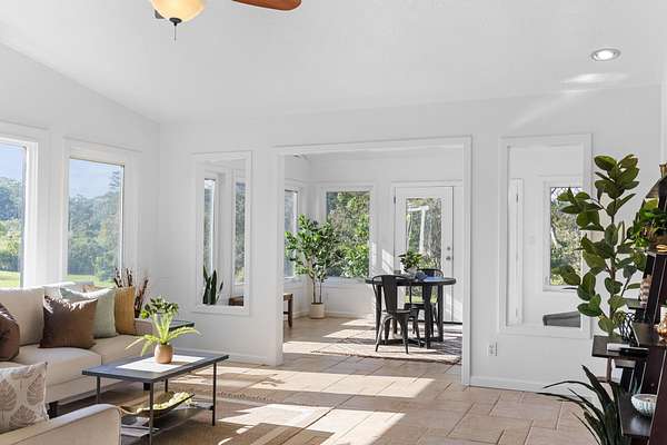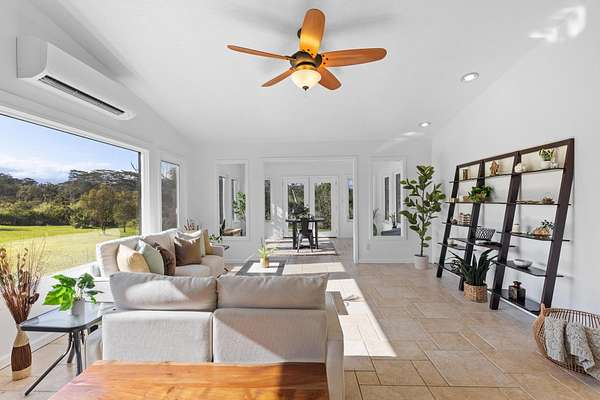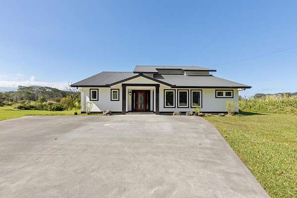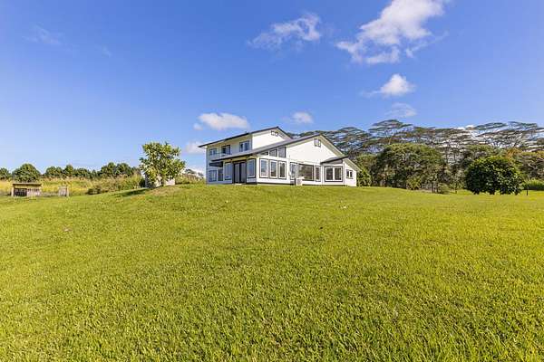 Big Island Farm for sale with Lush Landscaping & Modern Updates. Welcome to 17-4060 South Road, a stunning 5-acre property just outside of Keaau that offers a serene, park-like setting with mature landscaping and fruit trees, all while enjoying the convenience of county water. This well-maintained home has been recently updated with fresh interior and exterior paint, including the roof, and features tile flooring throughout. Step inside to discover an abundance of natural light streaming through large windows, highlighting the open-beam ceilings and spacious layout. The home boasts two inviting living areas plus a sunroom, perfect for relaxing and enjoying the greenery surrounding. A split AC unit in the main living room ensures year-round comfort. Upstairs, the expansive primary suite offers a private setting with a walk-in closet, a large en-suite bathroom featuring a jacuzzi tub, and a lanai overlooking the peaceful views of the beautifully manicured property and Mauna Kea. Outside, enclosed by a full perimeter of fencing you will find the lush grounds which include mature grass, an array of mature fruit trees such as 'Ulu, loquat, citrus, and coconut, and a thoughtfully cleared landscape with the removal of numerous Albizia trees. With a second gate and access to the end of the property boundary and a prime location, this unique estate is a must-see for those seeking privacy, space, and natural beauty, while being just 10 minutes from Hilo. Grow Food. Raise Animals. Build a Life That Feeds You! Don't miss this exceptional opportunity! Buyer and buyers agent to verify all information.