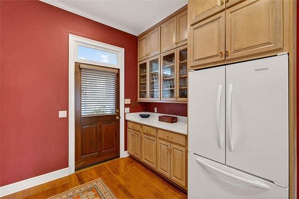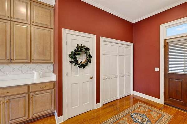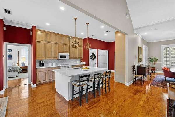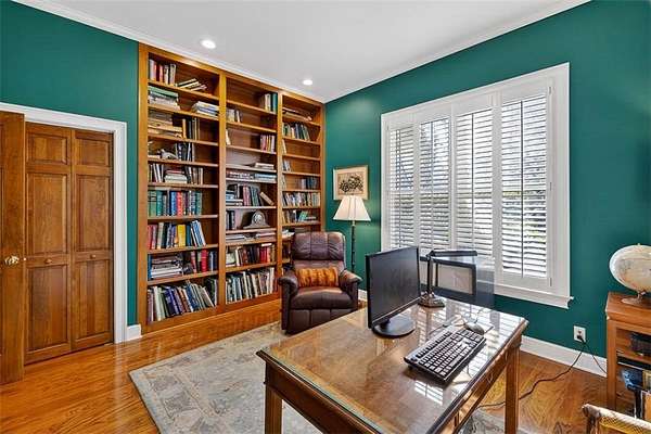 The kitchen features KitchenAid appliances, a center island, and a convenient washer and dryer closet just off the kitchen. The primary suite includes his and her closets and an en suite bath with double vanities. A split floor plan provides privacy, with two additional guest bedrooms sharing a Jack-and-Jill bathroom with tub and shower. A third bedroom doubles beautifully as a home office, complete with built-in bookshelves.