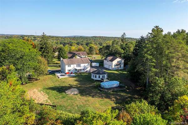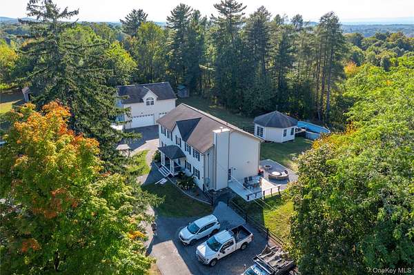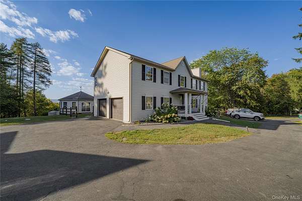 Welcome to 17 Brendalla Court - a stunning colonial-style home tucked away at the end of a peaceful cul-de-sac in Wallkill, offering the perfect blend of privacy, comfort, and versatility. Set on a generous 1.6-acre lot with sweeping Hudson Valley mountain views, this spacious 3-bedroom, 2.5-bath home features a bright, open-concept main level that seamlessly connects the kitchen and dining area to a new backyard patio and fire pit - perfect for entertaining or relaxing under the stars. The main floor also includes a separate laundry room for added convenience. Upstairs, the thoughtfully designed layout offers a private primary suite with en suite bath on one side, and two additional spacious bedrooms on the other, separated by a cozy open living space ideal for lounging or gathering. Step out onto the upstairs balcony to take in breathtaking views, or head outside to enjoy the above-ground pool and its own dedicated pool house. Central air ensures year-round comfort, while the impressive garage space caters to car enthusiasts, contractors, or hobbyists - including an attached garage with a separate office, plus a detached 2-car garage with an unfinished upper level, perfect for transforming into a guest suite. Love the outdoors? You'll appreciate the fenced-in portion of the yard, the separate chicken coop, tool shed, and the expansive land ready for your dream garden. Just a short drive to New Paltz, Gardiner, Highland and other local towns, this property is ready to welcome you home.