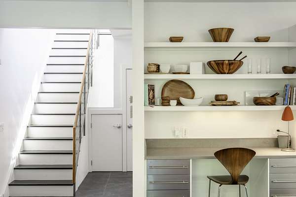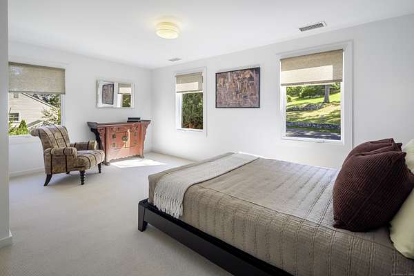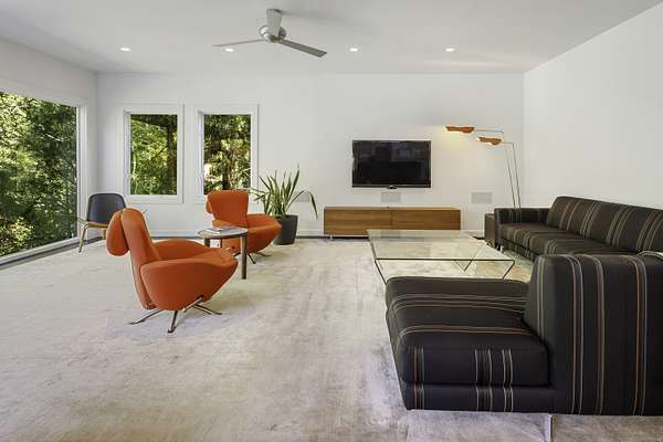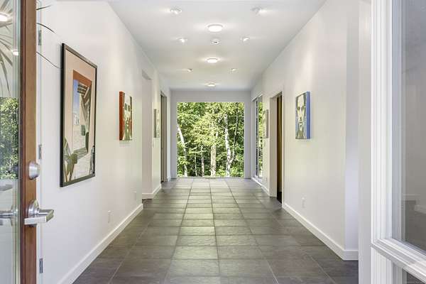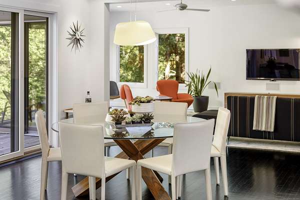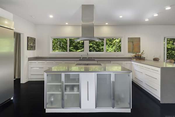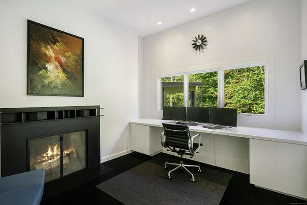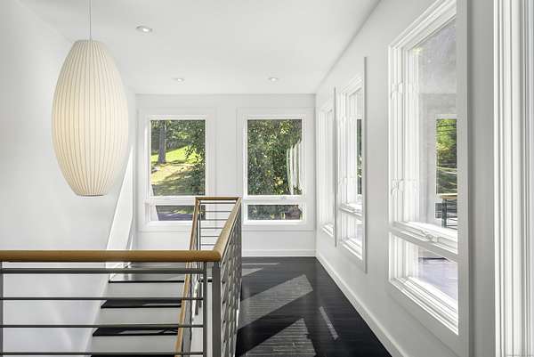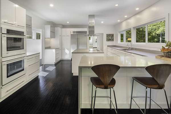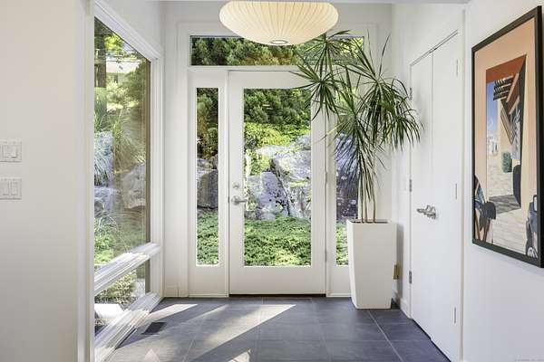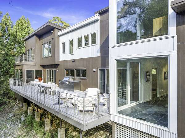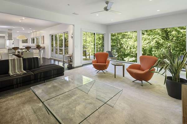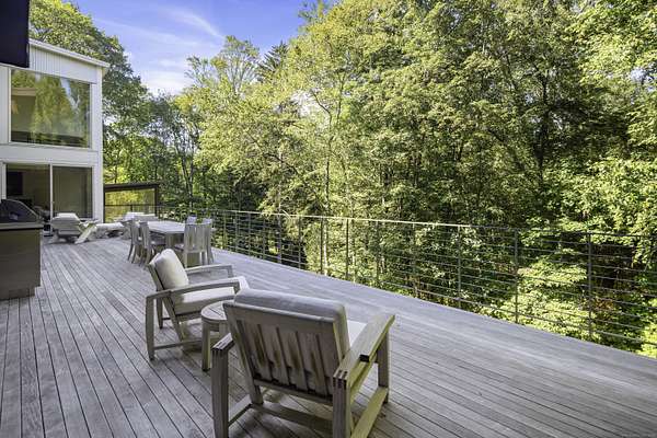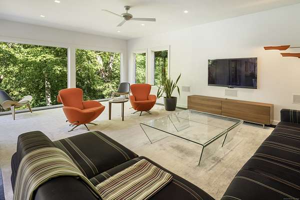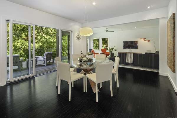 Perched high above the Goodwives River, this stunning Mid-Century Modern home offers sophisticated living in an extraordinary natural setting. Walls of floor-to-ceiling glass invite the outdoors in, seamlessly blending interior spaces with the serene beauty of the 1.8-acre private landscape. Reimagined by renowned architectural firm Joeb Moore + Partners, highlights include a dramatic cantilevered IPE deck that spans the back of the home-evoking the feeling of a treehouse floating in space. Superior finishes throughout this carefully curated home include warm walnut floors, a striking steel-wrapped fireplace, and vaulted ceilings that amplify the natural light. An entertainer's dream, this home is perfect for hosting family and friends-or simply curling up in one of the many cozy window nooks to watch the changing seasons and abundant wildlife. Ideally located just steps from the vibrant Corbin District-Darien's transformative downtown destination featuring NYC-caliber dining and boutique shopping yet only moments from the waterfront sanctuary of Great Island. A rare and inspired opportunity for design-forward, nature-infused convenient living within the award-winning Darien school district.