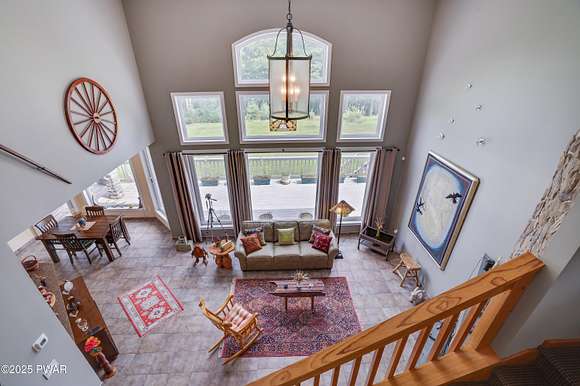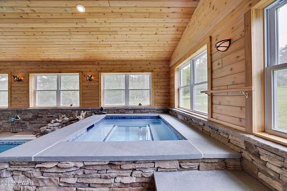 Rustic Castle on the Hill: A Haven of Serenity, Wellness & Timeless Luxury:Perched atop 11+ breathtaking acres, this majestic stone estate is more than just a home--it is a private sanctuary where nature, luxury, and tranquility harmoniously intertwine. From the moment you ascend the winding driveway, a sense of awe sets in. Panoramic mountain views, rolling lawns, and two tranquil ponds create an atmosphere of serenity, a sentiment shared by all who visit.Inside, cathedral ceilings rise above a soaring stone fireplace, exuding warmth & grandeur. Walls of glass flood the space with natural light, seamlessly blending the indoors with the breathtaking landscape beyond. Every detail of this home has been thoughtfully curated to elevate both comfort and sophistication. The chef's kitchen is a space of culinary inspiration, where every meal is enhanced by the beauty of nature just beyond the windows. The meditation room offers a tranquil retreat, a place to center oneself amidst the stillness of the surroundings. Designed for both indulgence and well-being, this estate also features an indoor pool, a private gym, and a spa-like atmosphere where relaxation becomes a way of life.A home meant to be enjoyed in every season, summers unfold poolside, in the gym, or on the deck, where morning coffee is enjoyed among whispering trees. Winters transform the property into a storybook retreat, a warm and inviting refuge. Spring awakens the land with daffodils and blooming fruit trees--apple, peach, and pear--planted with intention. It feels like a private wildlife sanctuary, where majestic eagles soar gracefully overhead, adding to the untamed beauty of the land.Beyond the home's beauty lies its functionality and flexibility. A second living quarters offers privacy and comfort for guests or multi-generational living. The estate is designed for both intimate moments and grand celebrations, effortlessly transitioning from peaceful retreat to lively gathering space.