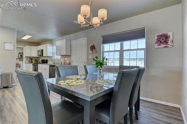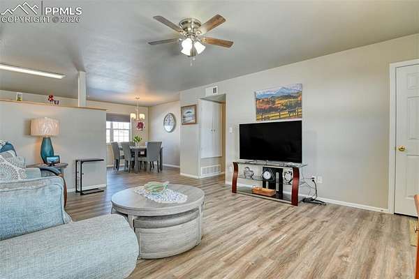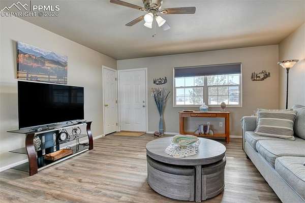 Beautifully updated ranch-style home set on 2.09 acres, offering an open-concept layout and a comfortable blend of indoor and outdoor living. The spacious living room features vaulted ceilings, abundant natural light, ceiling fan, and is vented for a wood stove, providing flexibility for added warmth and ambiance. The kitchen is thoughtfully designed with granite countertops, extensive cabinetry, stainless steel appliances, a breakfast bar, and a walk-in pantry, making it both functional and inviting. The open flow between the kitchen, dining, and living areas is ideal for everyday living. Ceiling fans are installed throughout the home for year-round comfort. The primary bedroom includes an adjoining bathroom, while two additional main-level bedrooms offer versatility for guests or home office use. The laundry area is conveniently located with direct access to the attached two-car garage. Outside, the level meadow setting provides usable acreage with a fenced pasture and a separate fenced backyard suitable for pets. The corner lot enhances privacy and space, and the property is zoned for horses. Additional features include a metal roof, covered concrete patio, storage shed, radon mitigation system, household well, and septic system. Enjoy expansive mountain and meadow views in a peaceful rural setting while benefiting from a thoughtfully updated home designed for comfortable mountain living.