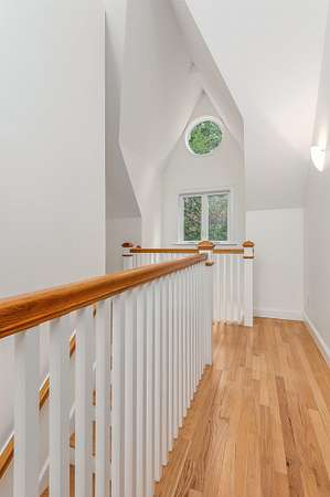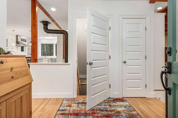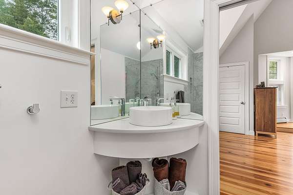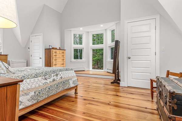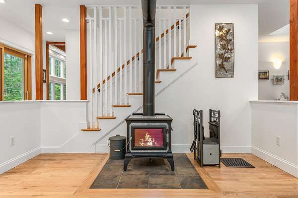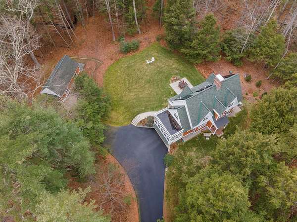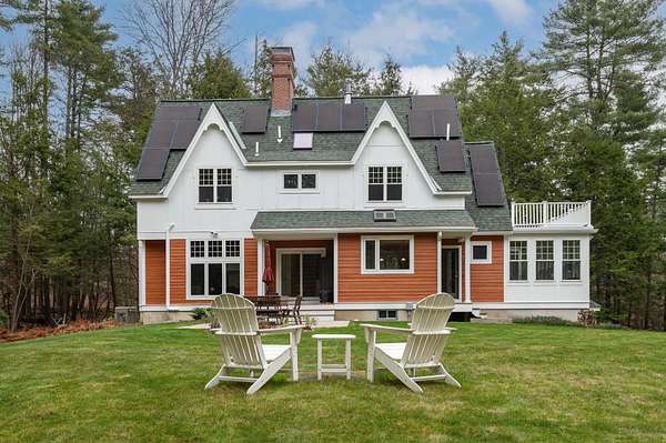 Designed by Boston architect Jeremiah Eck and nestled on almost 5 acres, this beautiful home features a thoughtful design with the latest systems and updates. Hardi-Plank siding and PVC trim make its exterior maintenance free. Entering through the custom-tiled foyer, you are immediately greeted by the abundant light that fills the house. The spacious and bright kitchen features high ceilings, gleaming hardwood floors, a large peninsula, a pantry closet, and Miele professional appliances. It opens to the dining area with its custom window seat and Hearthstone stove. The exposed-beamed great room with its striking windows on 3 sides brings the beauty of the outdoors in, and features a Rumford gas fireplace with its custom door. Pella Sliders give access to the porch and patio. The all-season sunroom offers panoramic forest views for the perfect reading and entertainment center. The 1st floor also holds a half bath and custom-tiled laundry room with sink. Upstairs you'll find sweeping gables that add spacious beauty throughout. The primary suite has 2 walk-in closets and the bath offers a striking walk-in dual shower. The 2 additional bedrooms are connected by a Jack-and-Jill bath with pedestal tub and shower. Further equipped with solar panels, central AC, & a standby generator. Adding significant value is the 600 sq ft studio with HVAC mini-splits offering potential for office space, an ADU or whatever your heart desires - all less than 3 miles of downtown Exeter