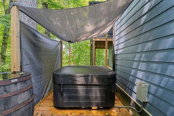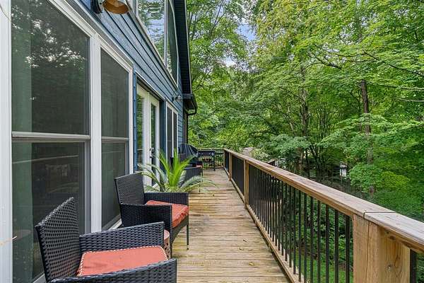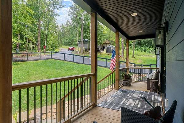 - Balcony, Covered Deck, Covered Front Porch, Covered Patio, Enclosed Porch, Exterior Lights, Fence, Fenced Yard, Landscaping, Mature Trees, Outdoor Lighting, Screened Porch, Storage Building, Storage Shed, Trees