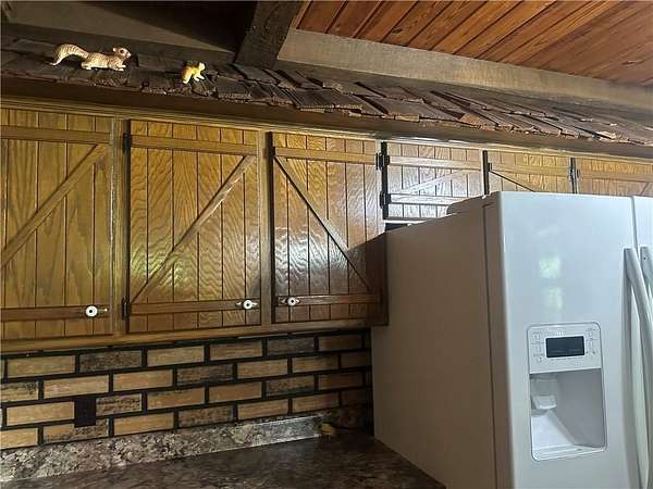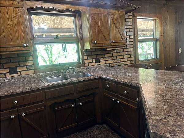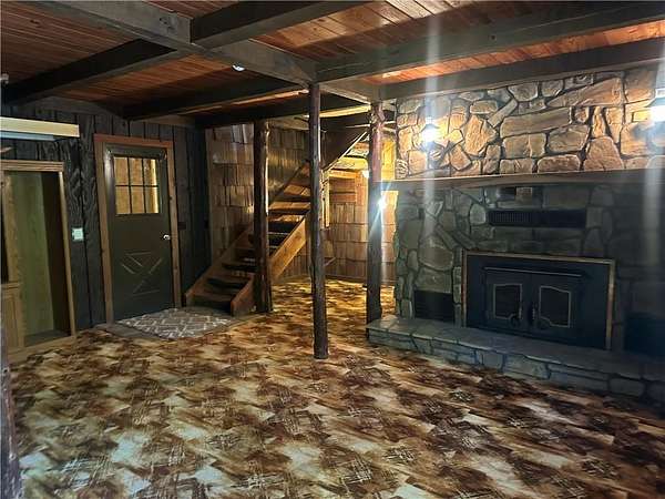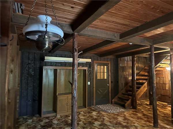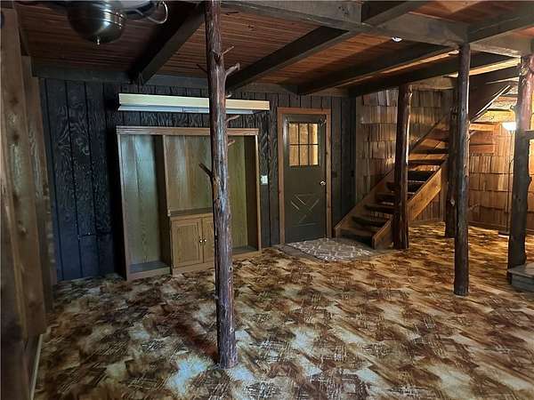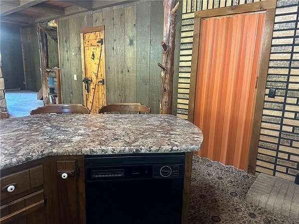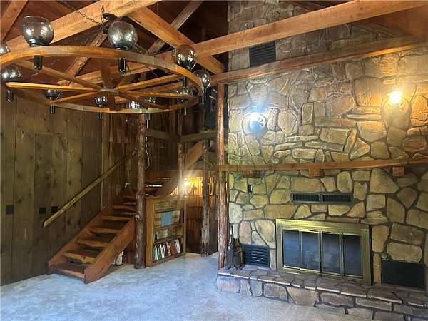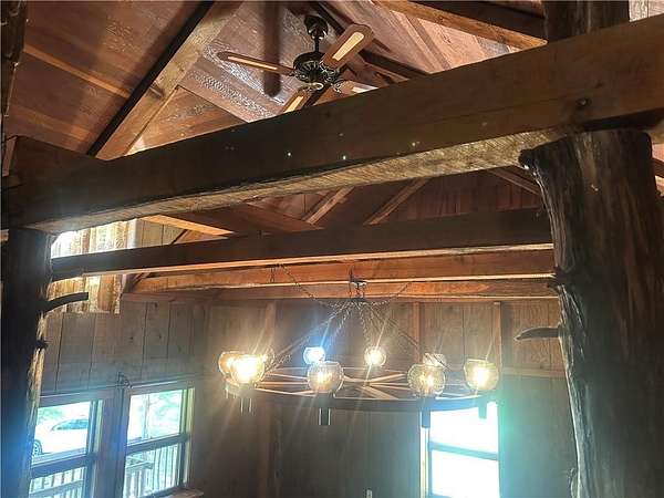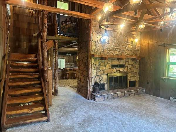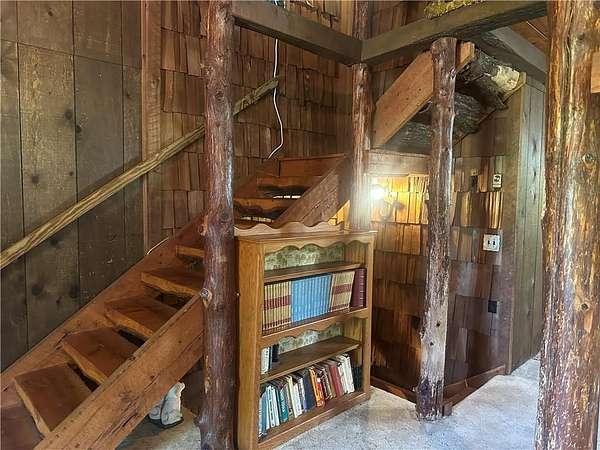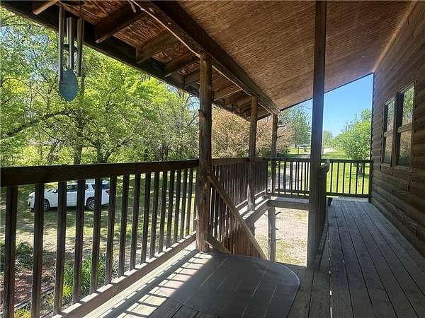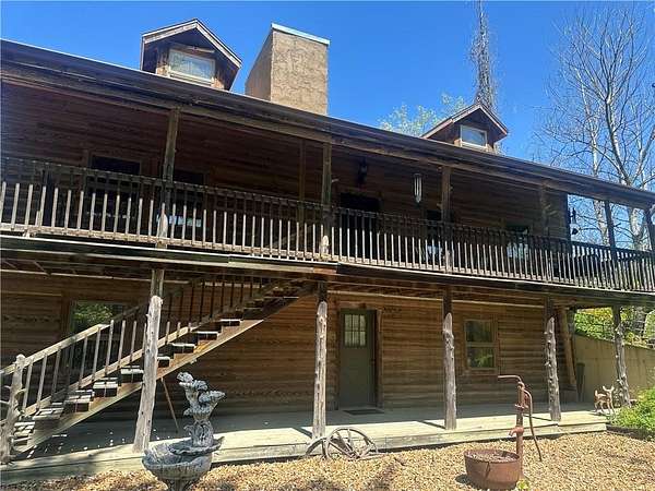 This is it! A log cabin style multilevel overlooking the owner's lake in front. A unique interior with hand hewn post and stairs and interesting rugged walls of shakes and wood mostly. Cultured stone on floor entries and 2 beautiful culture stone fireplaces. Enjoy the evenings on the deck cooking out and enjoying the moment. If you need multiple garages there are 4 with concrete floors and electricity attached to the home. Have you always wanted a large workshop...wish granted here with huge workshop wired for an air compressor, surround shelving, concrete floor and attached to the house. There is a storm shelter and or storage. There needs some updating and etc. The owners did sell a small triangle shape that squares off property to a neighbor so a new legal description and plat will be in order. Seller marked on the plat in supplements approx.