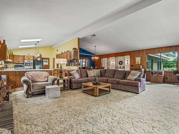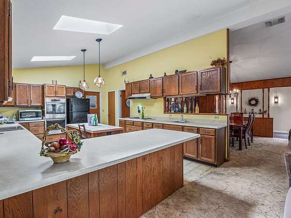 - Breakfast Bar, Ceiling Vaulted, Fireplace, Fireplace Wood Burning, Inside Storage, Kitchen Island, Pantry, Skylight, Smoke Detector, Walk-In Closet, Wallpaper, Walls Paneled, Wet Bar
