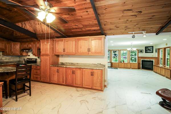 - Bar, Ceiling Fans, Eat-In Kitchen, Granite/Quartz/Stone, Kitchen Island, Master Bath, Open Floor Plan, Tile Floors, Wood Floors