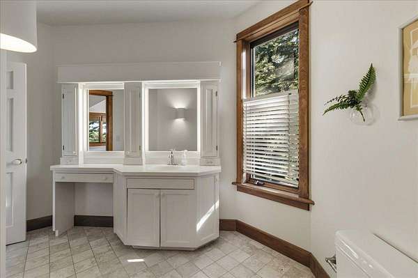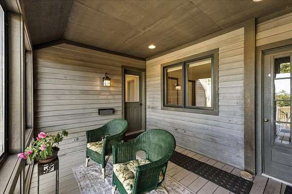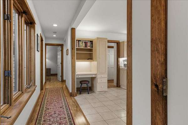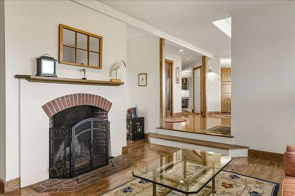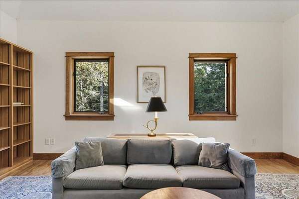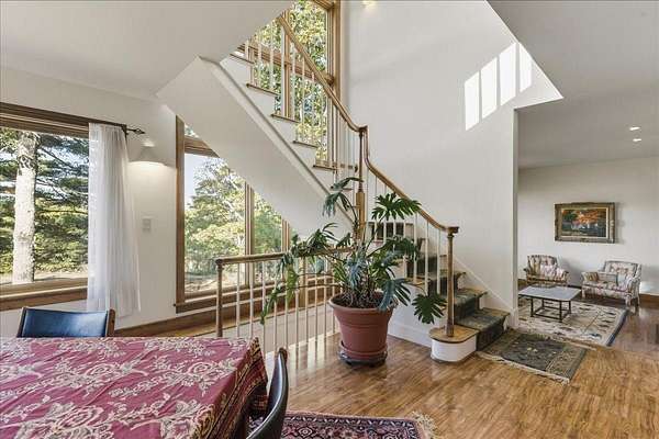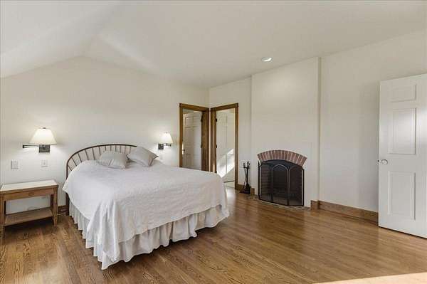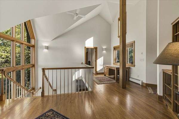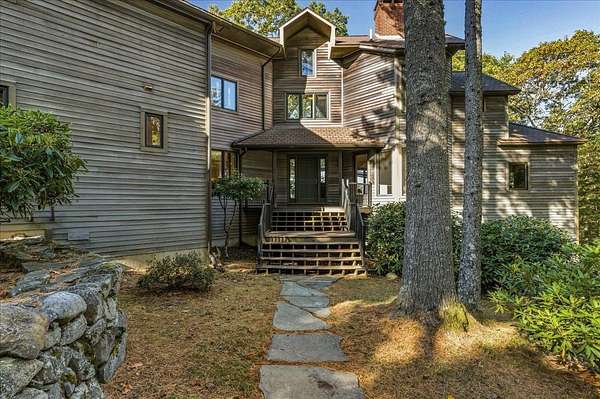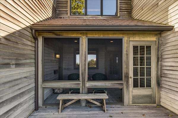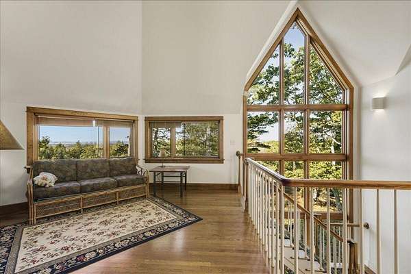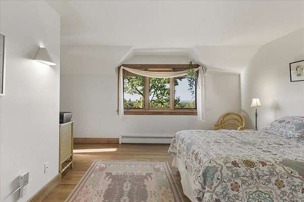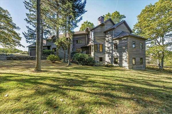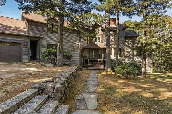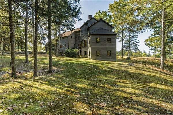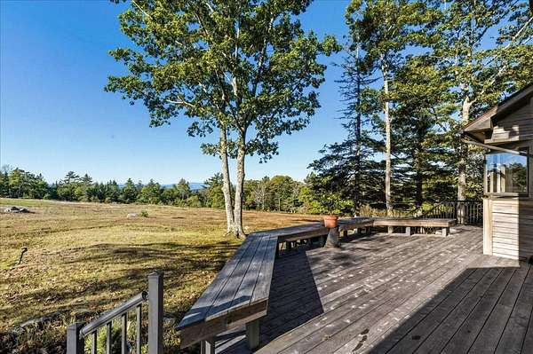 Tucked into a private 20-acre setting on Caterpillar Hill, this contemporary home was designed to bring in natural light and capture views of the fields and Eggemoggin Reach. Built in 1990 by Michael Hewes, the property offers over 3,800 square feet of finished living space across three levels, including a spacious recreation room with walkout access. The first floor includes a large eat-in kitchen, open dining area, and adjoining living and family rooms, each with generous windows, wood floors, and fireplaces that add warmth and character. A first-floor bedroom and bath provide flexible living options. Upstairs, the primary suite includes a beautiful full bathroom and large walk-in closets, along with two additional bedrooms, a sitting room, and plenty of storage. Beautiful stonework surrounds the exterior, complemented by multiple decks and paths leading through open blueberry fields. The setting provides a peaceful blend of open and wooded areas with long views toward Eggemoggin Reach. Additional features include a screened porch, attached two-car garage with storage above, and a finished basement with a large recreation room, bath, and utility area. The home is heated by radiant hot water and designed for comfort in every season. Located near the heart of Sedgwick and a short drive to Blue Hill and Deer Isle, the property combines privacy, space, and proximity to the coast.