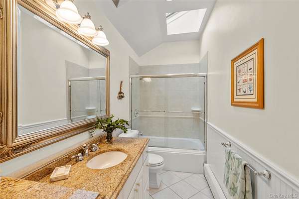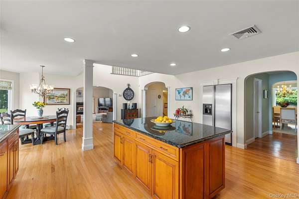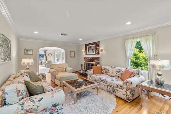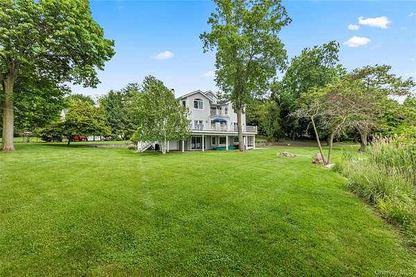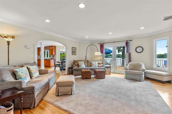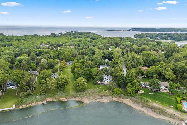 Fabulous Strongs Neck waterfront colonial set on 1.5 private acres with over 200 feet of shoreline. Sweeping western views provide magnificent sunsets year-round. This fully renovated, custom-built home offers three levels of breathtaking water views and exquisite millwork throughout, including hardwood floors, wainscoting, crown molding, vaulted ceilings, and arched windows and doorways. The open-concept floor plan is ideal for entertaining. The spacious chef's kitchen features granite countertops, stainless steel appliances, a walk-in pantry, built-in microwave, oven warming drawer, and a sunlit dining area with spectacular water views and sliders to an expansive deck-perfect for alfresco dining and sunset gatherings. The primary suite includes a walk-in closet with built-in shelving, a luxurious bath with Whirlpool jacuzzi, and a private balcony with panoramic bay views. Work from home in a stunning office with a separate entrance, vaulted ceiling, gas-heated fireplace, and picturesque water views-perfect for productivity and inspiration. A finished walkout basement with water views and separate heating/cooling zones provides versatile living or entertaining space. Situated on a quiet cul-de-sac, the property features a level, sprawling lawn, stone-tiered terraced gardens, in-ground sprinklers, and an additional storage garage. Kayak or paddleboard from your own backyard. Located in the top ranked Three Village School District, the home is just minutes from Frank Melville Park, West Meadow Beach, and the Stony Brook train station. Beach rights with a boat ramp complete this exceptional coastal retreat. Beach association dues: $150/year.