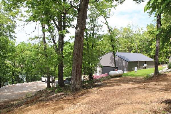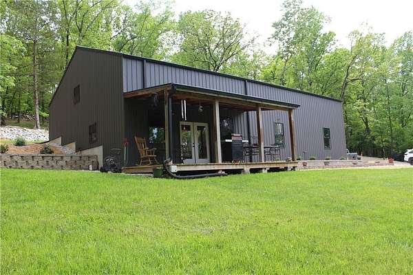 Nestled on 2.73 acres in a gated subdivision, this unique property offers privacy and scenic beauty, bordering Corps of Engineer land on two sides with views of the surrounding landscape and nearby Bull Shoals lake. This 64' x 36' barndominium features a 24' x 36' finished living space and a 40' x 36' fully heated shop with 14-ft walls. The living area showcases a vaulted tongue-and-groove pine ceiling, tile floors, granite countertops, stainless steel appliances, pantry, and spacious closets. A custom tile shower, solid oak 36" interior doors, and oak trim add quality throughout. The loft bedroom provides a cozy retreat, while French doors open to the outdoors. Enjoy the covered deck and landscaped yard. Located in a community with a private airstrip, this property blends comfort, function, and outdoor living and less than 10 miles to boat launch.